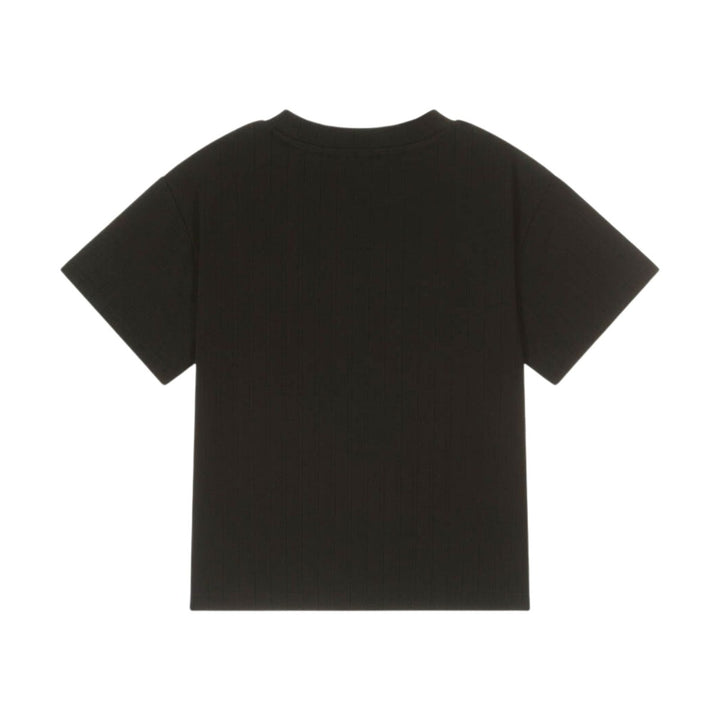 Black cotton T-shirt for girls by American brand DKNY, made in comfortable jersey. A T-shirt with a difference, it is self-striped and has a rubberised black and white logo for instant designer appeal.
