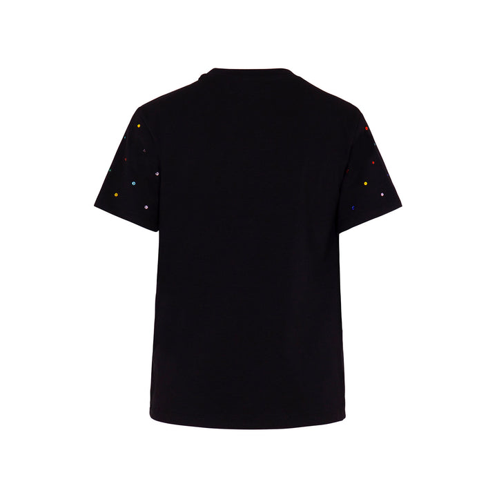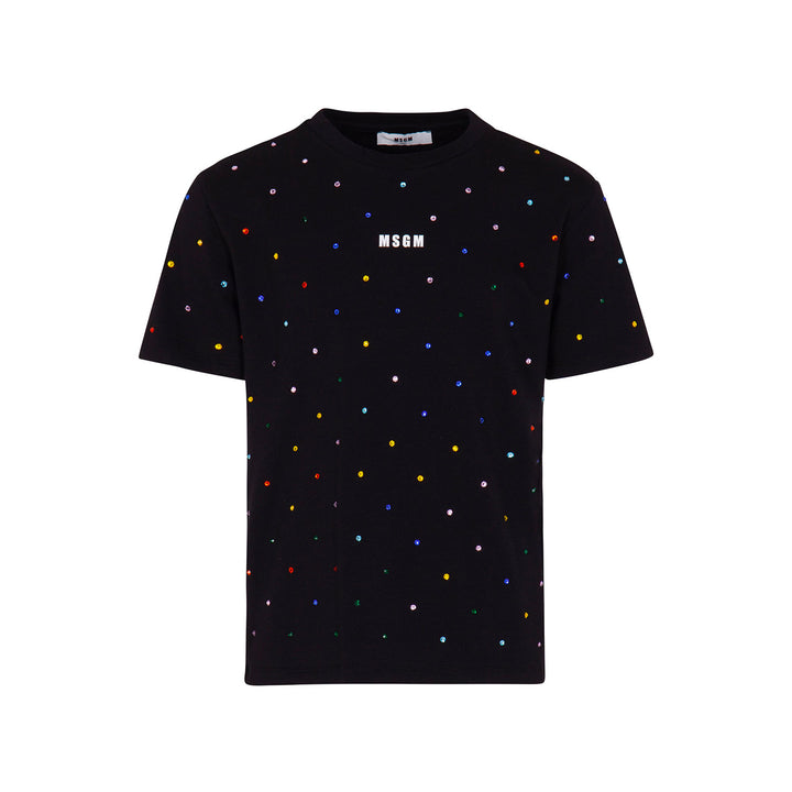 Black T-shirt for girls by MSGM, sparkling with colourful diamantés for an eye-catching look. Made in soft and comfortable cotton jersey, this stylish crew neck tee has a white micro logo print on the front for a signature designer finish.