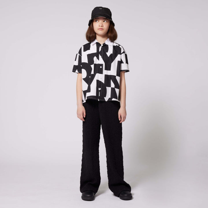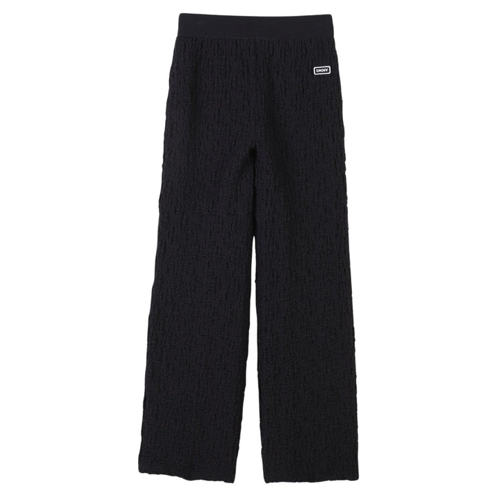 Black, wide-leg jersey trousers for girls by DKNY, with a textured look. They have a comfortable, elasticated waistband and a logo badge on one side.