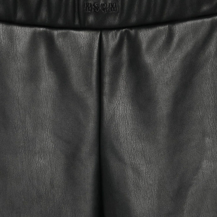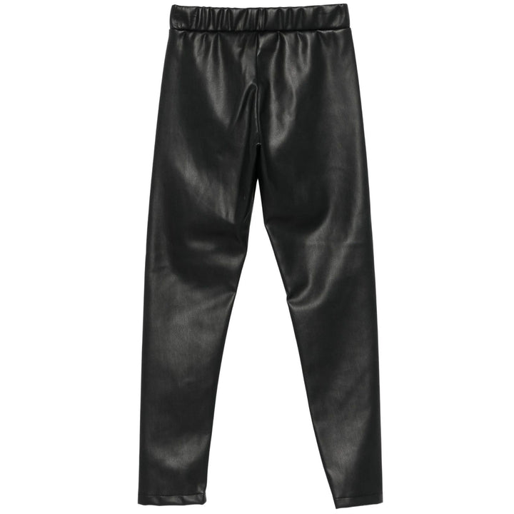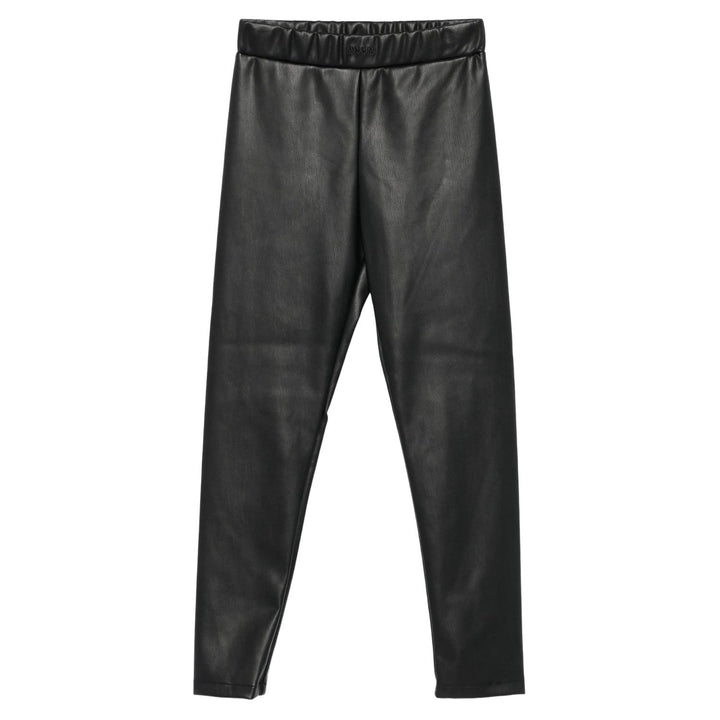 Girls Black Embroidered Logo Print Leggings crafted from soft stretchable fabric for a comfortable fit. Featuring delicate embroidered logo detailing on the side and an elastic waistband, these leggings offer a stylish and sporty look perfect for pairing with tees, hoodies, or casual tops.