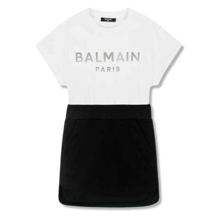 Black and white dress for girls by luxury designer Balmain, made in comfortable cotton jersey. The T-shirt style bodice has seamless short sleeves and a silver logo design on the front for an instantly recognisable look. A two-in-one design, the skir