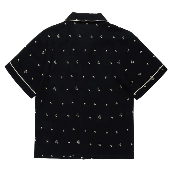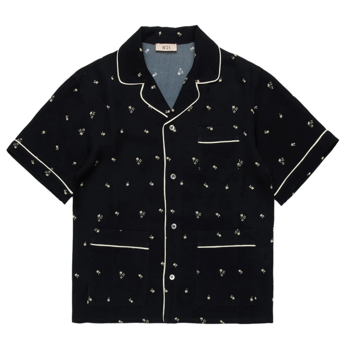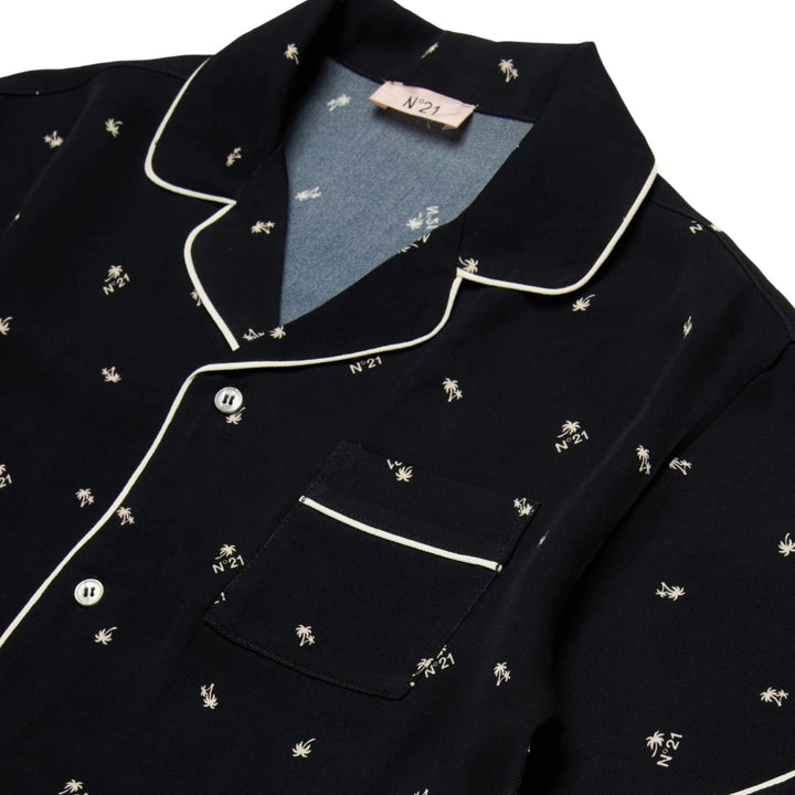 Short-sleeved viscose crepe bowling shirt with all-over print Palms. Contrasting color piping. Pockets on the front. Heart-side pocket. Front button closure.