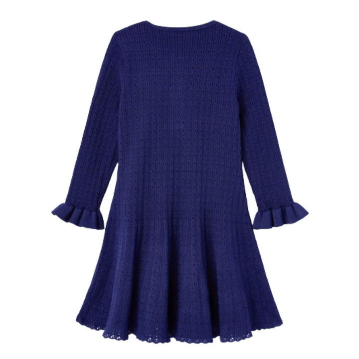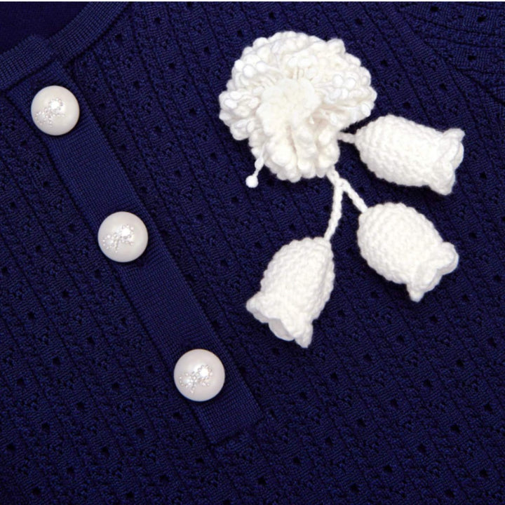 Elegant and charming, this navy blue pointelle dress from Self-Portrait features delicate floral patch detailing and intricate knitwork. A perfect pick for special occasions, offering both comfort and timeless style.
