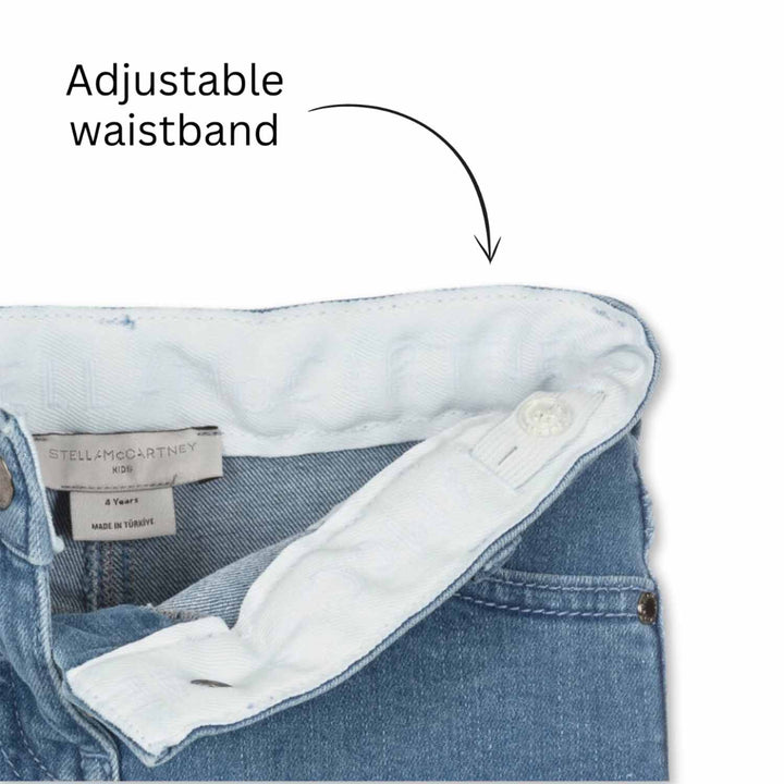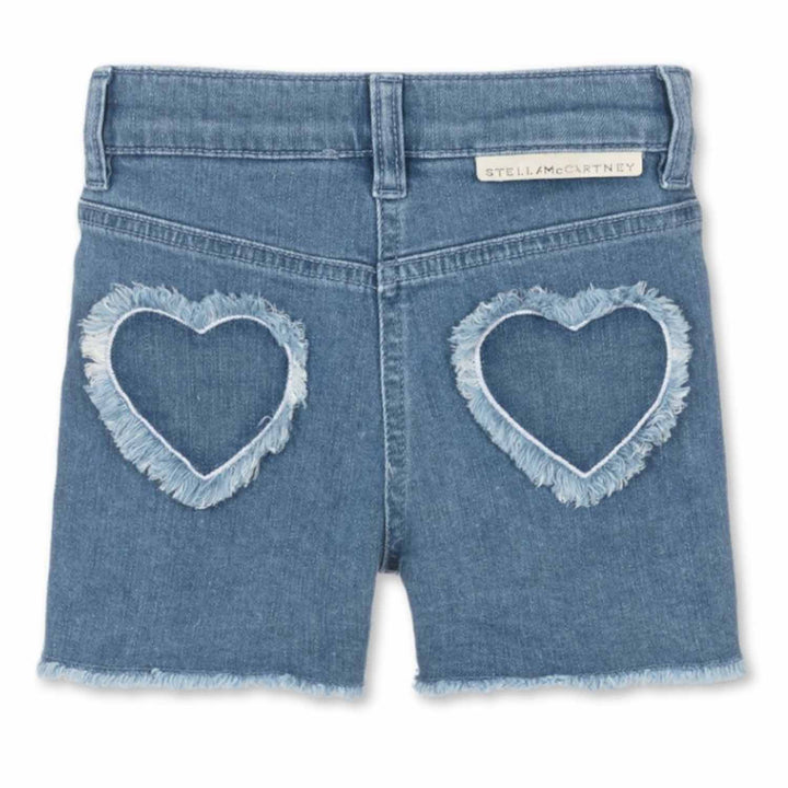 In a cool washed blue denim, these organic cotton shorts are from Stella McCartney Kids. Designed with a slight stretch for comfort, they have stylish frayed hems, with matching frayed heart motifs on the back. There is a branded hook and eye and zip