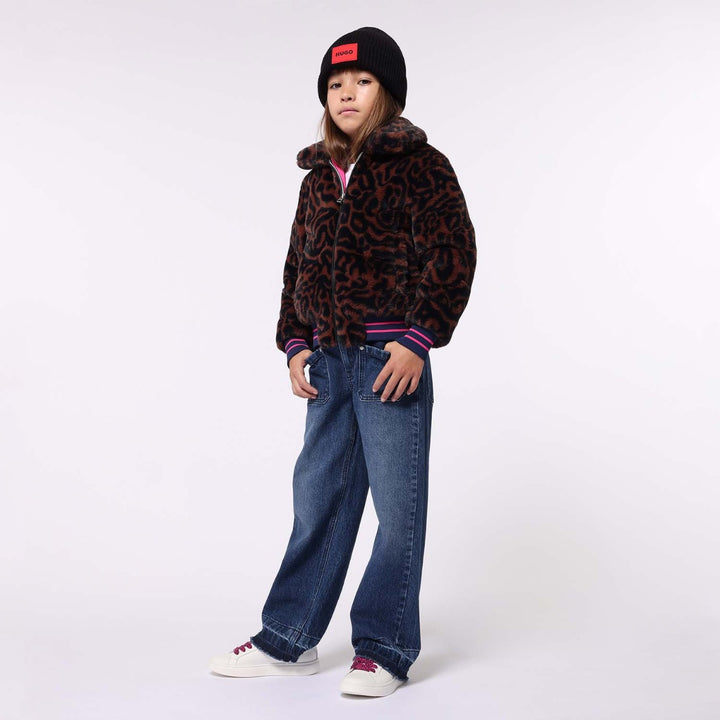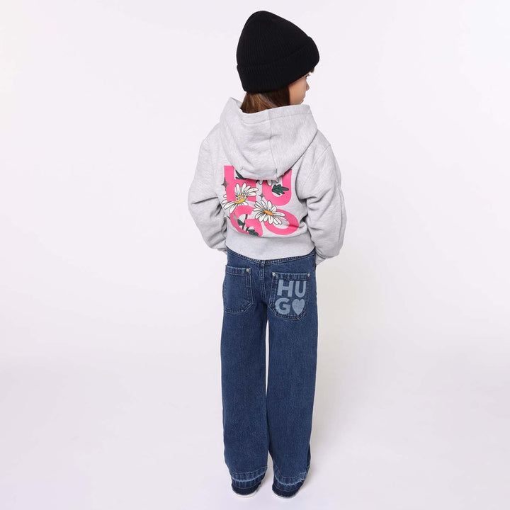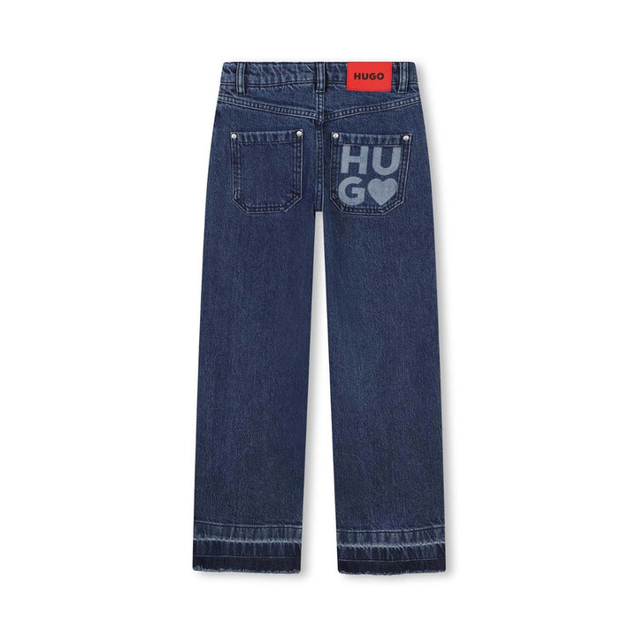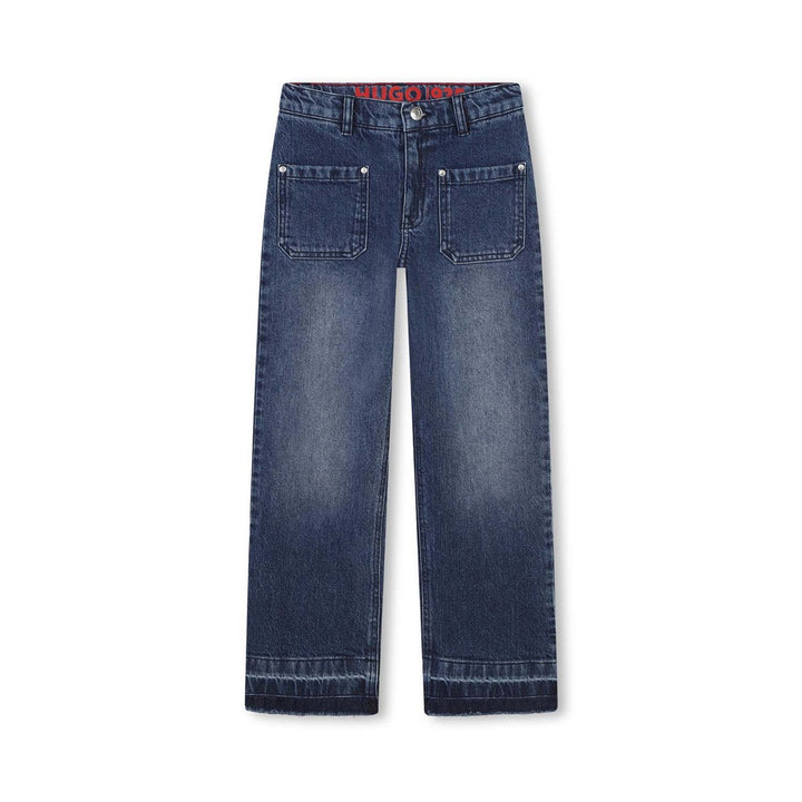 Dark blue loose fitting jeans for girls by HUGO, made in non-stretch denim. With classic four-pocket styling, they have stand-out contrast white stitching for an updated look.