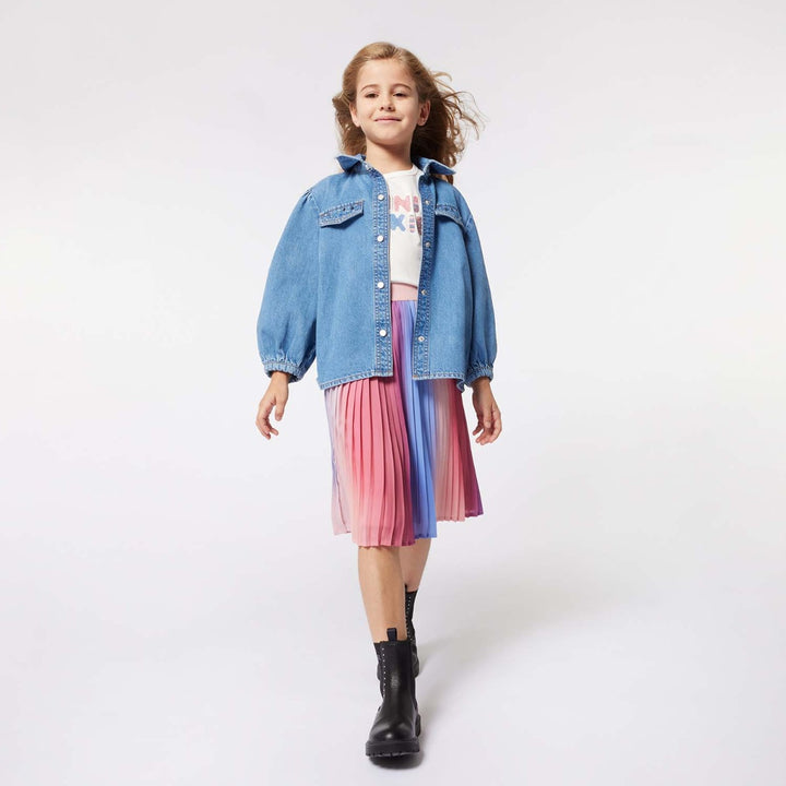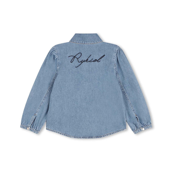 Blue denim shirt for girls by Sonia Rykiel Paris, with an embroidered script logo across the back. Made with cotton for comfort, it is beautifully soft and mid-weight. For a glamorous touch, there are sparkly rhinestones on the faux pocket flaps and the shirt fastens with pearly poppers. It is designed with puffed long sleeves gathered at the cuffs with a popper fastening and the hem is shaped to complete the stylish look.