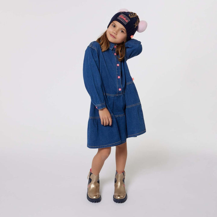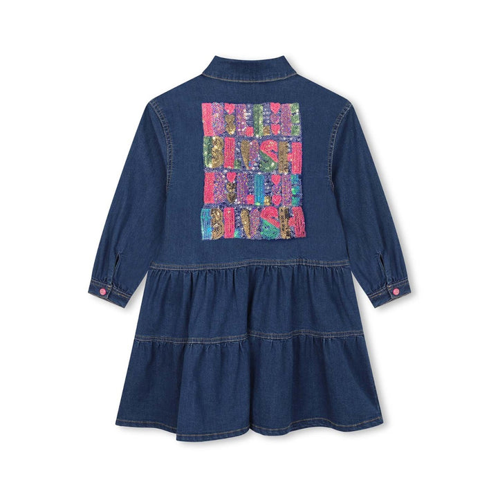 Blue denim dress for girls by Billieblush, made in soft cotton. Comfortable to wear, it features a colourful 'Billiblush' motif on the back in sparkly sequins for a fun finish. This cool dress has a tiered skirt. long sleeves and glittery pink popper fastenings on the front and cuffs.