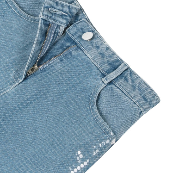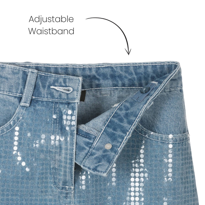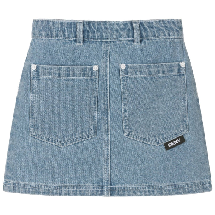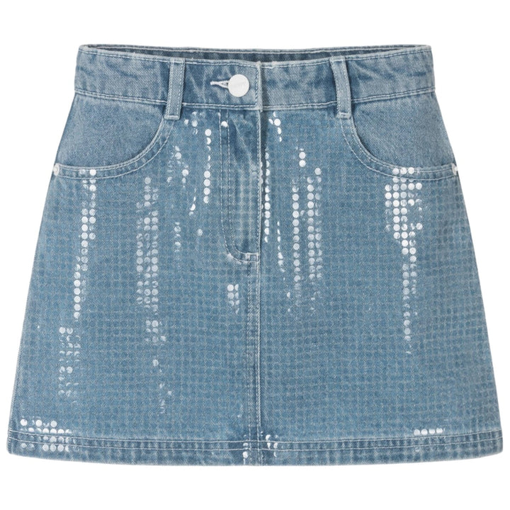 Mid blue skirt for girls by DKNY, made in non-stretch cotton denim. This timeless style has four pockets and white, branded hardware. Great for a party look, it has a clear sequin effect print on the front, which gives the skirt extra shine..