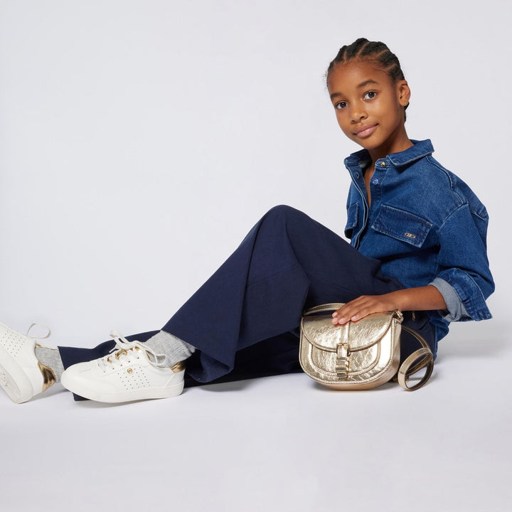 Girls blue denim slim-fit shirt crafted from a soft cotton blend with stretch for easy movement.