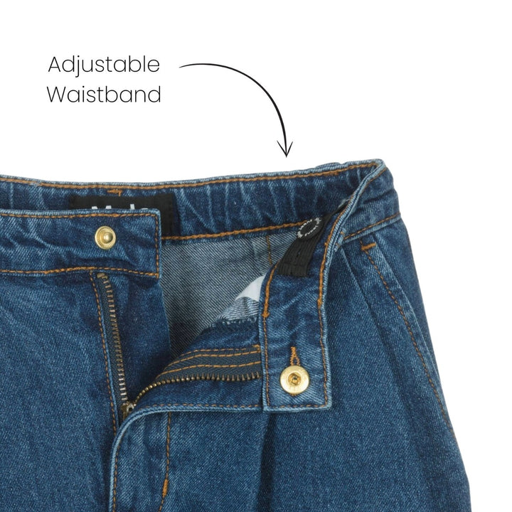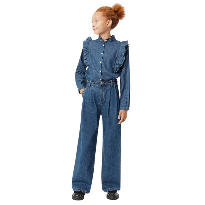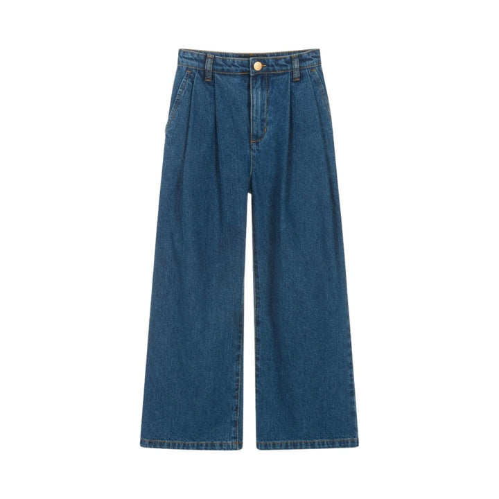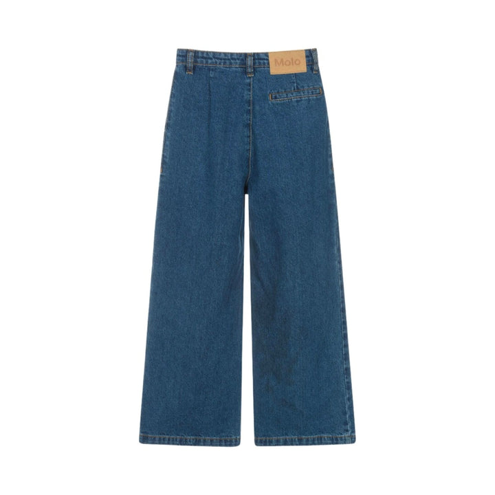 Mid-blue cotton denim jeans for girls by Molo, designed with stylish wide legs in an extra relaxed fit. These comfortable jeans are soft-pleated below the waist with slanted front pockets and a logo patch stitched above the faux back pocket. They fasten with a branded gold-tone popper and zip and have an adjustable waistband to ensure a great fit.