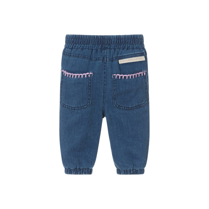 Lovely blue chambray trousers for little girls by British designer, Stella McCartney Kids. Made in soft organic cotton, they have bohemian-inspired embroidery on the legs and the pockets. Using brightly coloured thread, the embroidered flowers have h