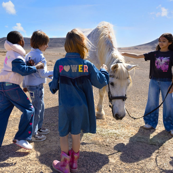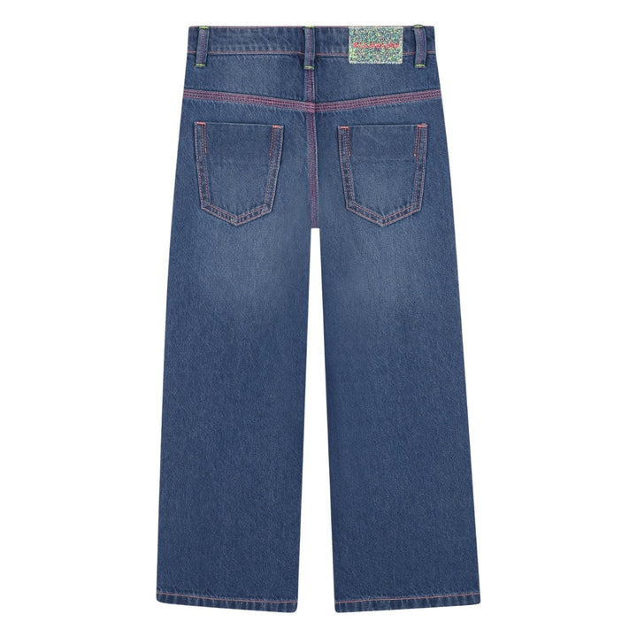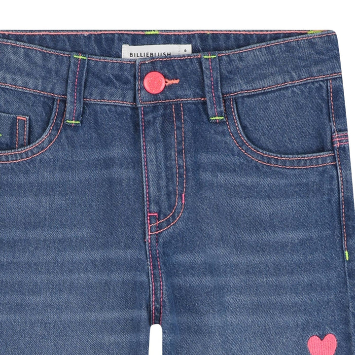 Girls blue jeans made from 1% cotton, featuring embroidered heart prints for a charming touch. Designed with a classic fit for comfort and everyday style.