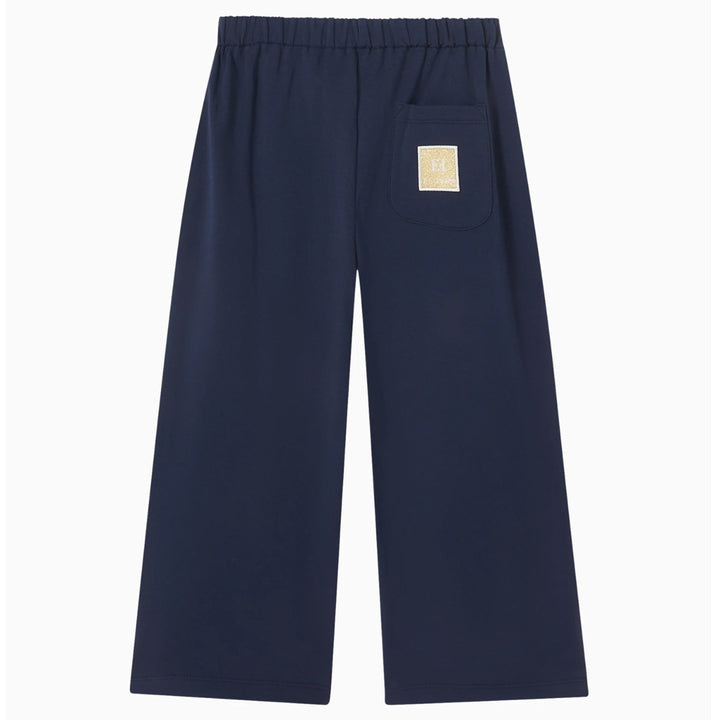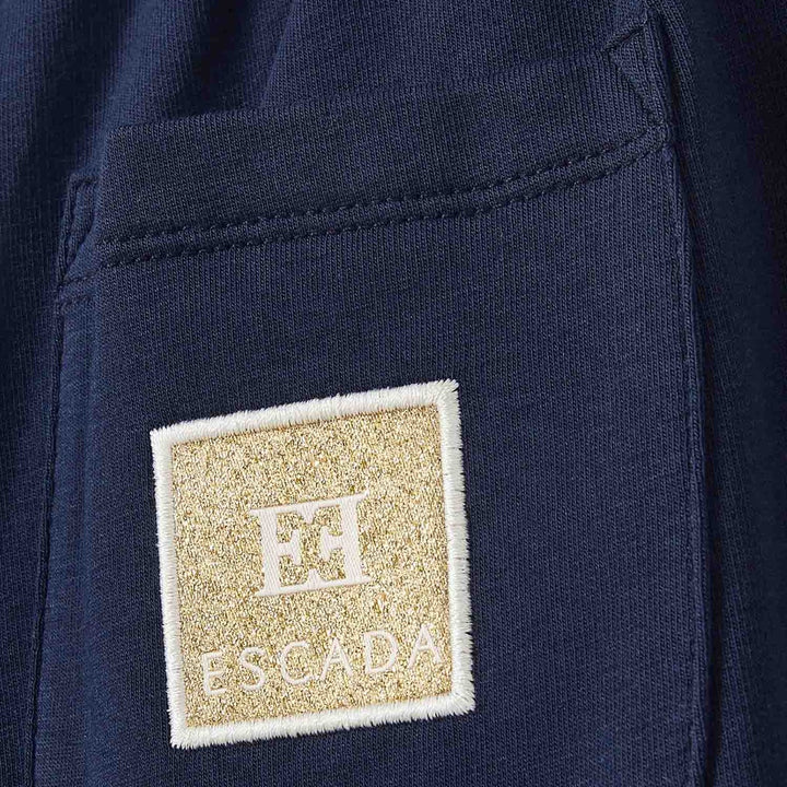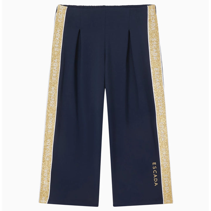 This Escada girls pant features a stylish blue and golden logo-print design with flared legs, crafted from a comfortable blend of 95% cotton and 5% elastane. Perfect for a chic yet casual look, it comes in a vibrant blue color.