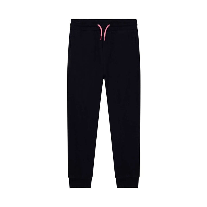 Girls comfortable navy blue joggers by MARC JACOBS, made in soft mid-weight sweatshirt jersey for warmth. There is a fun, fluffy faux fur embroidered MJ logo in pink and red on the back. The elasticated waist is easy to adjust with the bright pink drawstring and there are handy side pockets.