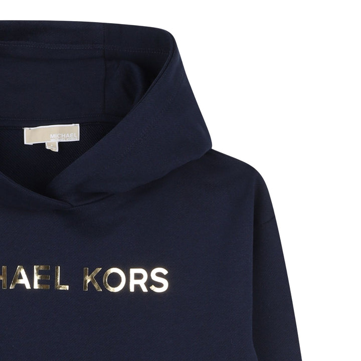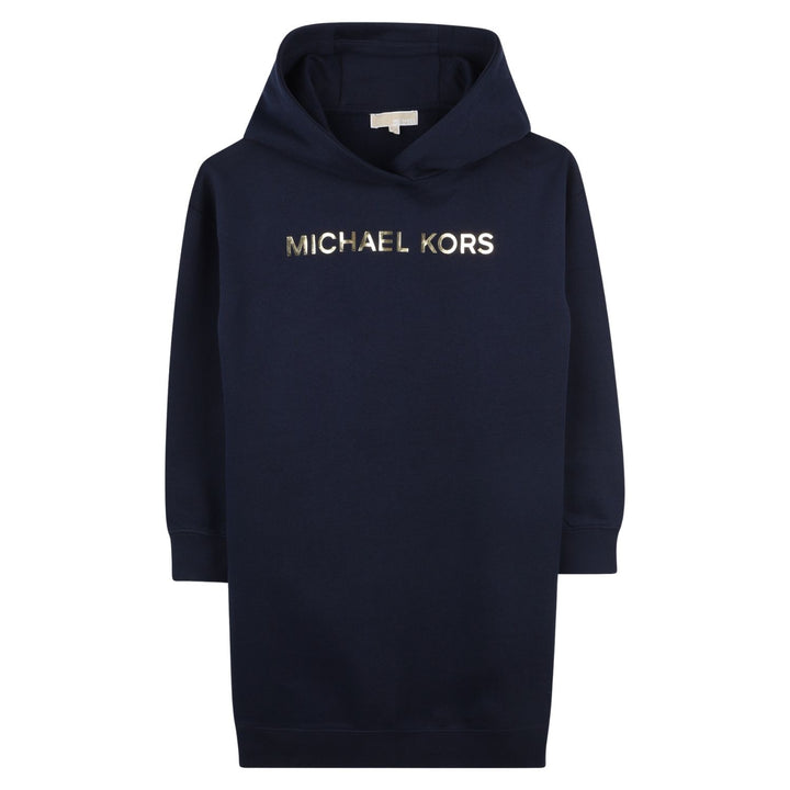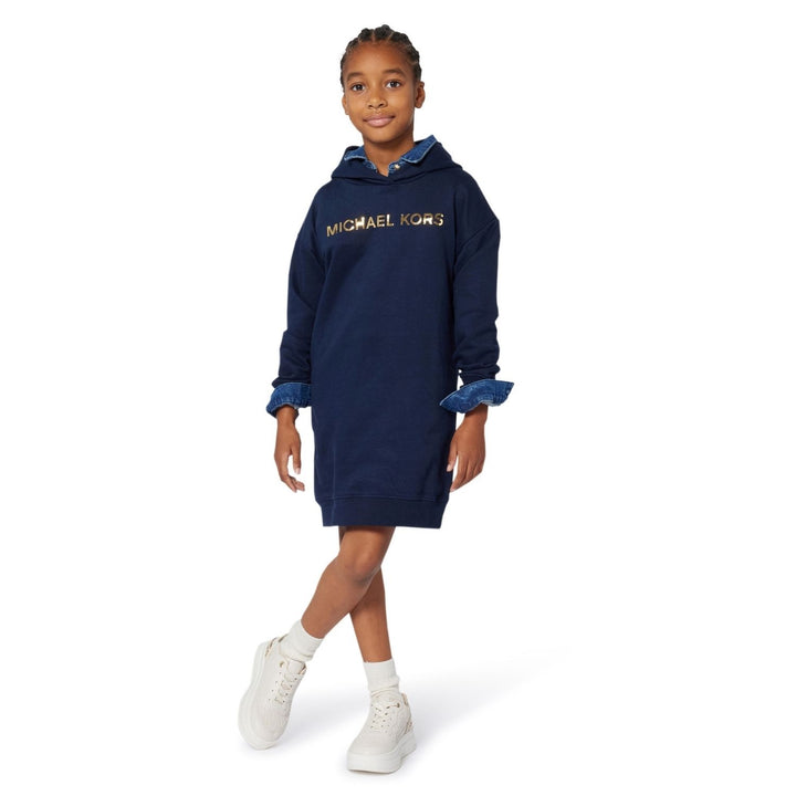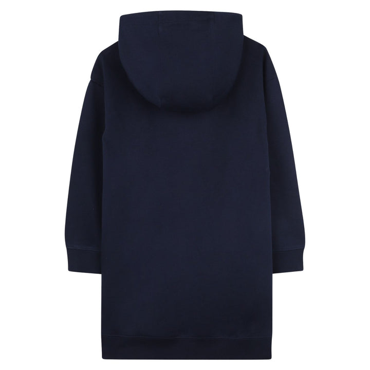 Girls blue hooded dress featuring a stylish logo print, crafted from soft and breathable cotton for all-day comfort.