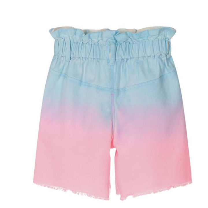 Blue and pink ombre shorts for girls by Billieblush. Made in lightweight twill, they have a comfortable, elasticated waist with useful belt loops and jetted side pockets. They fasten with a glittery pink popper and zip and have fun distressed hems.