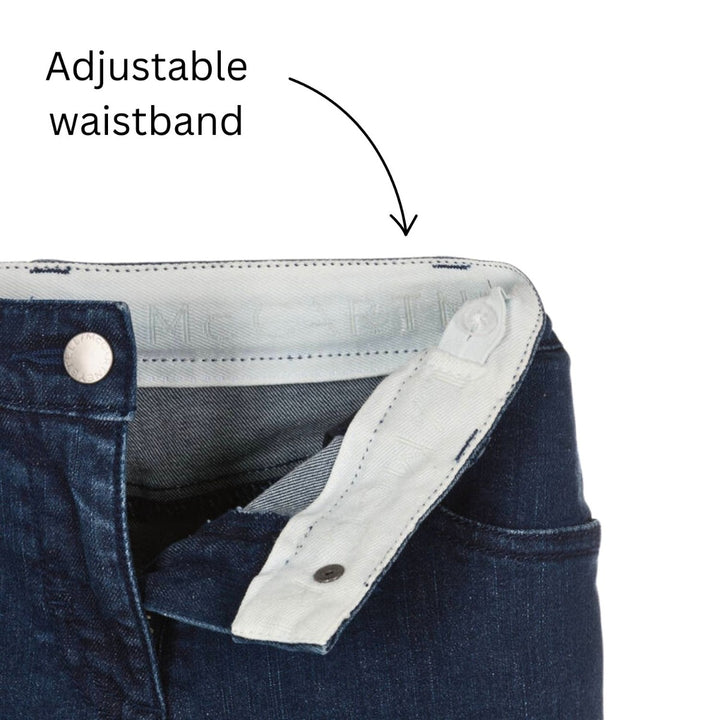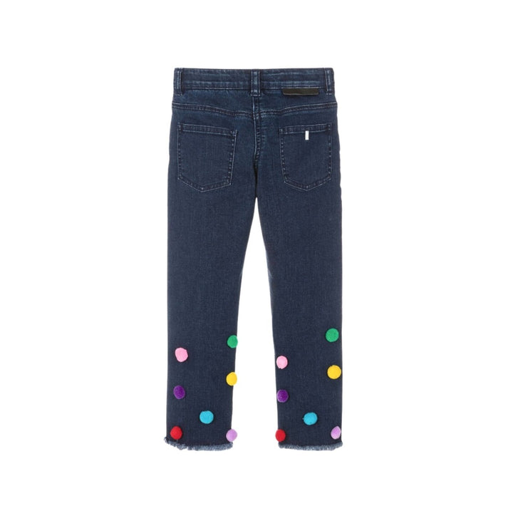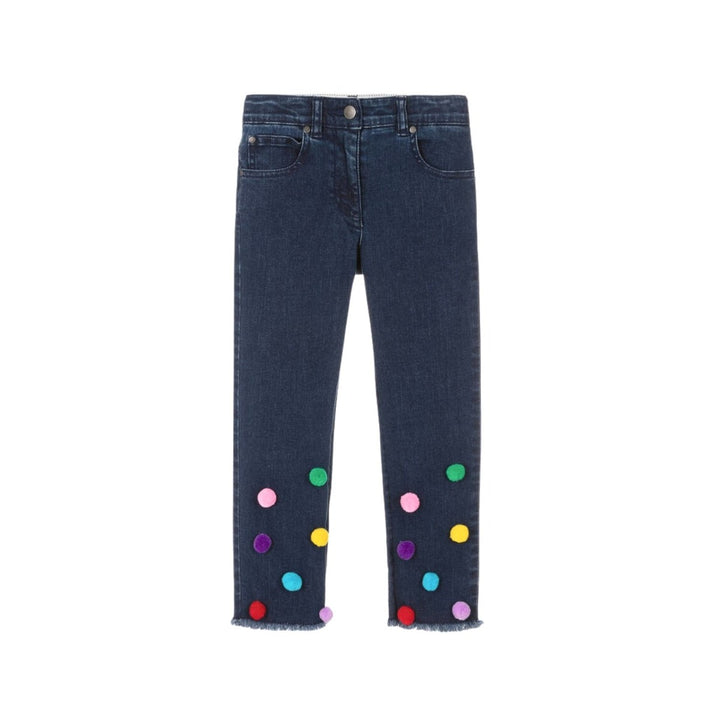 Dark blue denim jeans for girls by Stella McCartney Kids, decorated with 3D pom-poms for a colourful touch. Made from organic cotton, these skinny jeans have five-pocket styling and fringing on the ankles for extra detail. They have an adjustable waistband with a black logo tab on the back. They are finished with dark grey rivets and a hook and zip fastening on the front. The Stella McCartney fit can be quite small so choose a size up if you want room to grow.