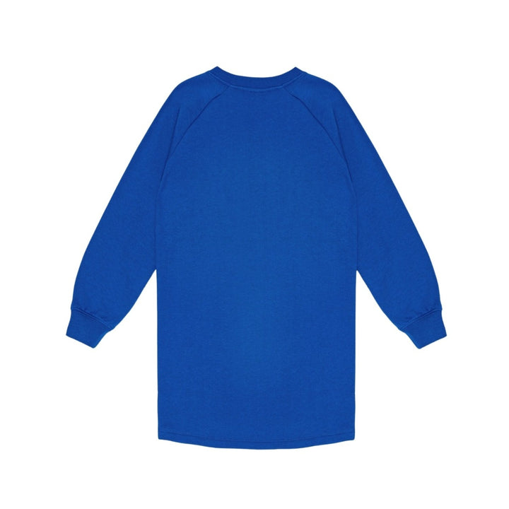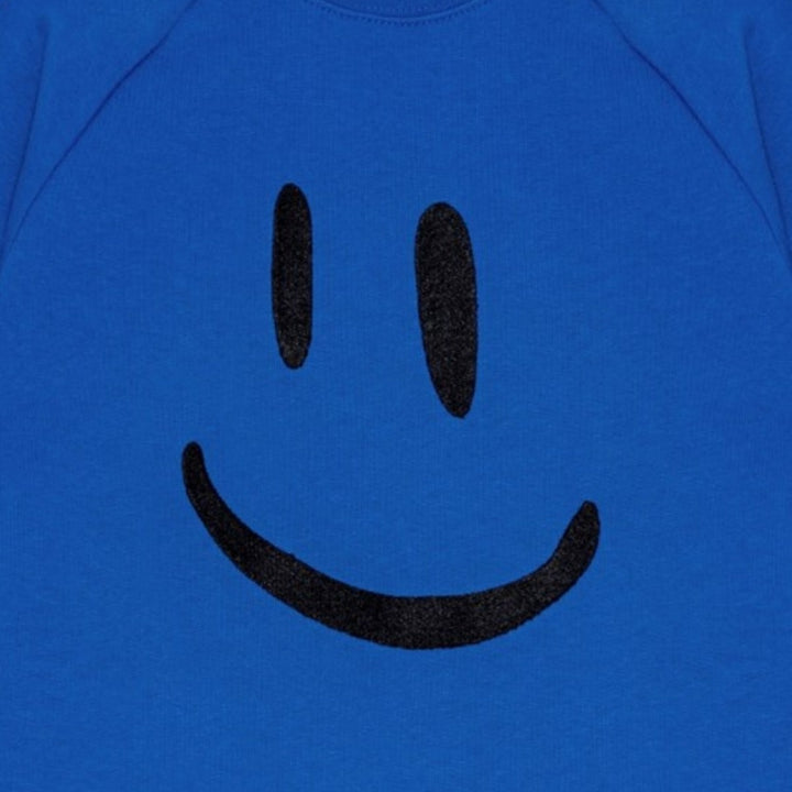 Blue jersey dress in soft organic cotton with a loose fit, ribbed edges at the neckline and sleeves, and a brushed inner face that makes it extra soft and warm to wear. The dress features a black embroidered smiling face on the front.