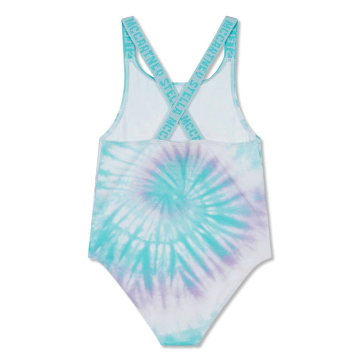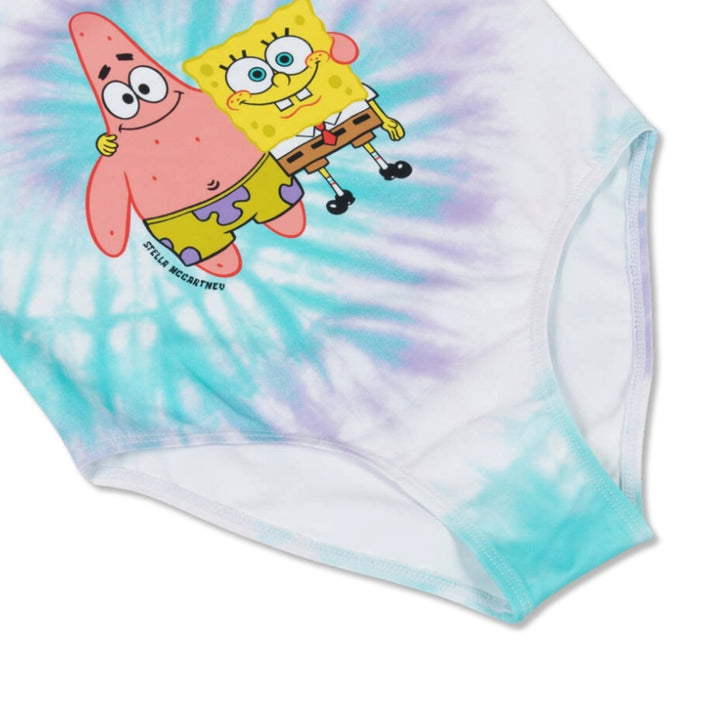 From Stella McCartney Kids, a lovely blue and purple tie-dye patterned swimsuit for girls. Part of the brand Spongebob Squarepants collection, it features the main character with his friend Patrick. Silky smooth and stretchy with UPF50+, the swimsuit has elasticated, logo jacquard shoulder straps and a small logo print on the front for a designer touch.