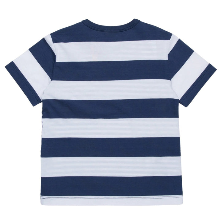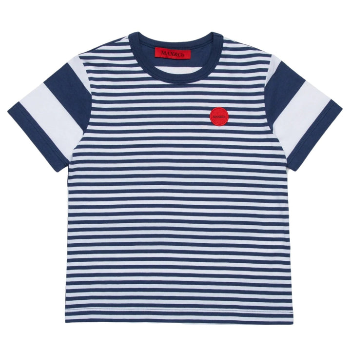 Short-sleeved cotton yarn-dyed jersey T-shirt. Characterised by an all-over print with stripes in two different sizes. Red Dot patch branded with the MAX&Co. logo applied to the front on the heart side. Contrasting colour piping. Ribbed construction on crew-neck.