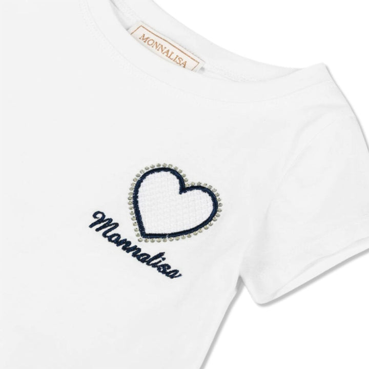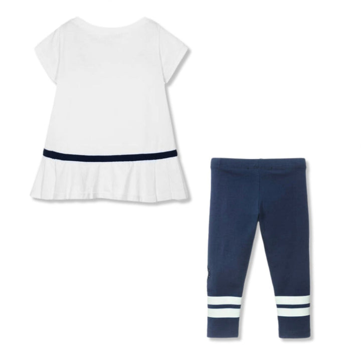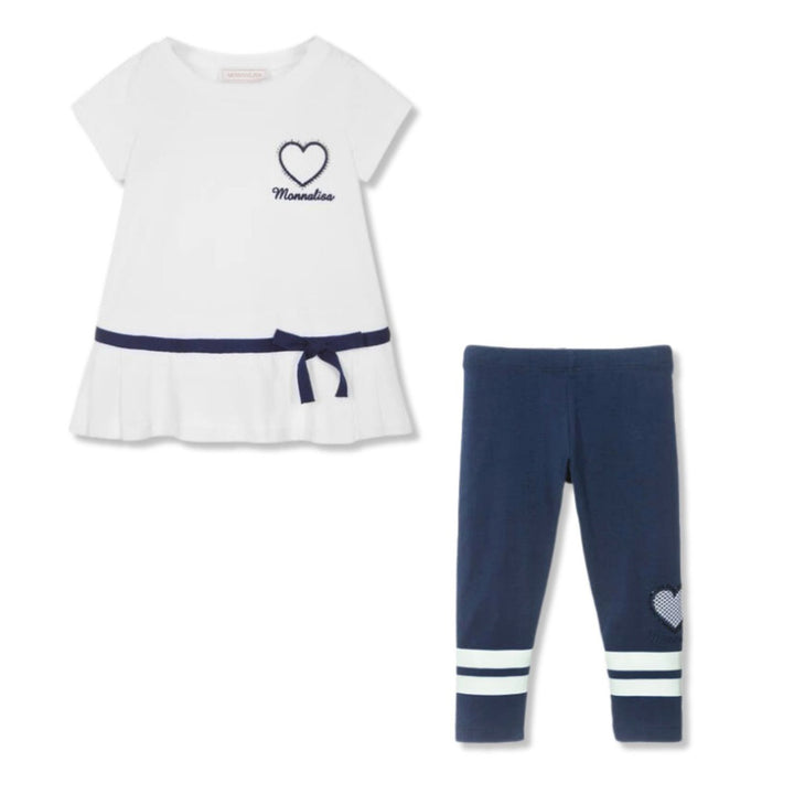 Navy blue and white leggings set for girls by Monnalisa, in soft cotton jersey. Both pieces feature a sparkly diamante heart applique and an embroidered logo. The tunic top has a pretty ribbon trim around the hemline, and the leggings are striped at