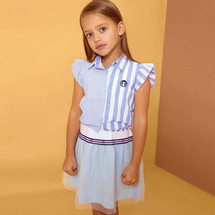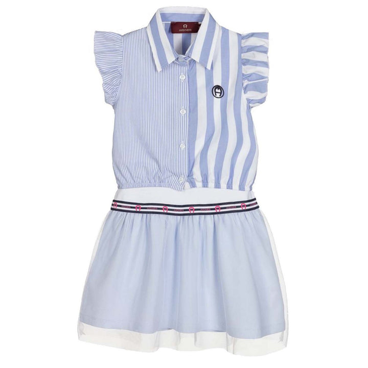 Blue and white dress for girls by AIGNER, made from cotton jersey. The dress is embroidered with the signature 'A' horseshoe logo in navy blue and the skirt has a netting overlay. It comes with a blue and white striped cropped blouse with a navy blue