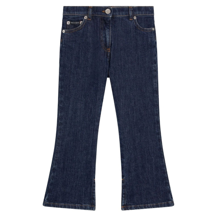Dolce & Gabbana Kids dark blue flared jeans featuring a five-pocket design, belt loops, and a logo patch at the back. Made in Italy from a cotton blend with a hint of stretch.