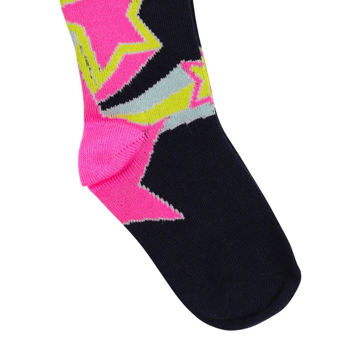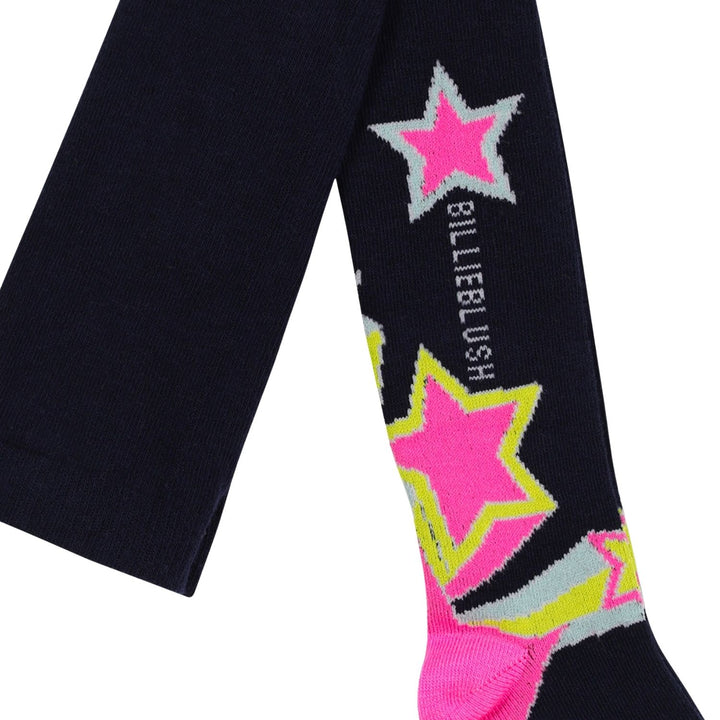 Girls blue tights adorned with pink shooting star motifs, made from a soft cotton blend with added stretch for comfort and a perfect fit. Ideal for adding a fun touch to everyday outfits.