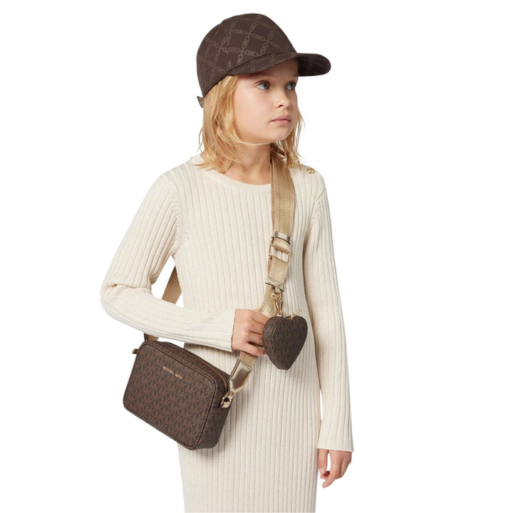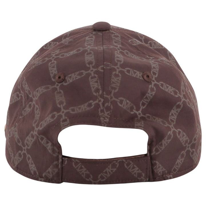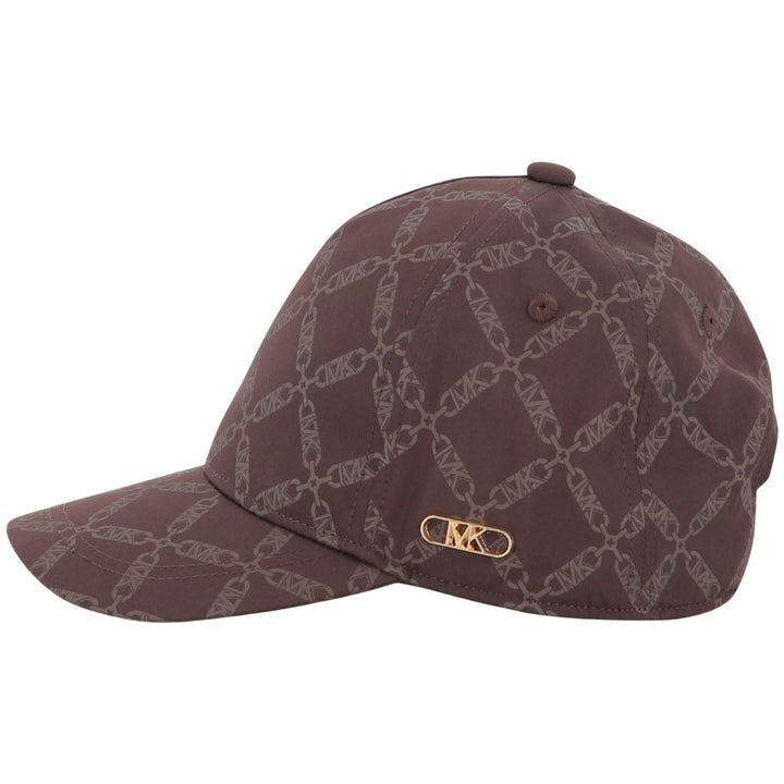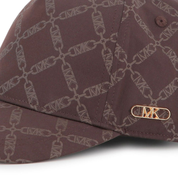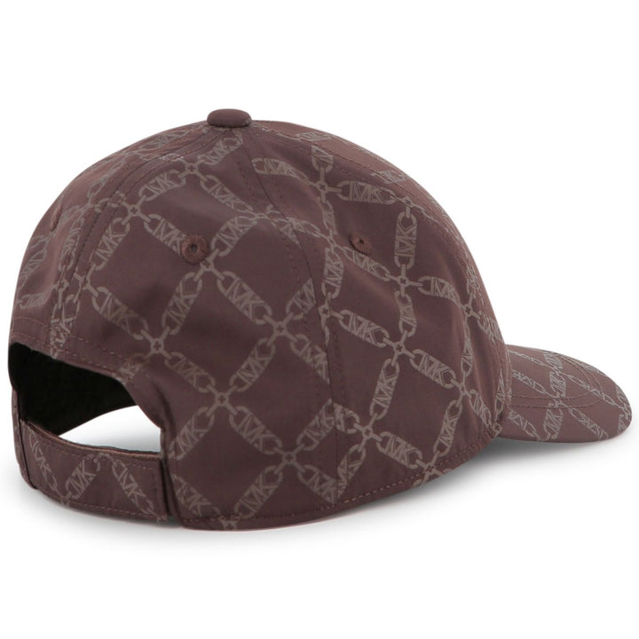 Girls brown cap featuring an all-over logo print, made from soft and durable polyester for a stylish look.