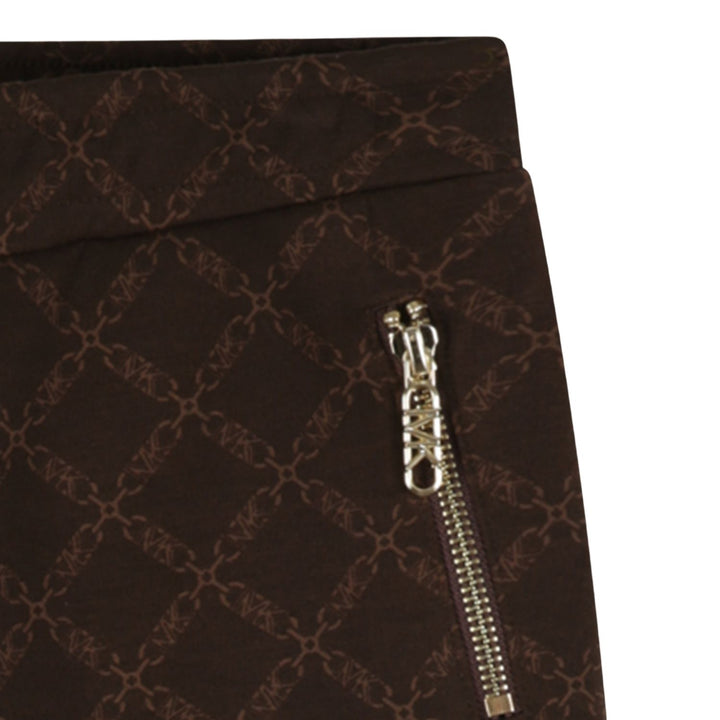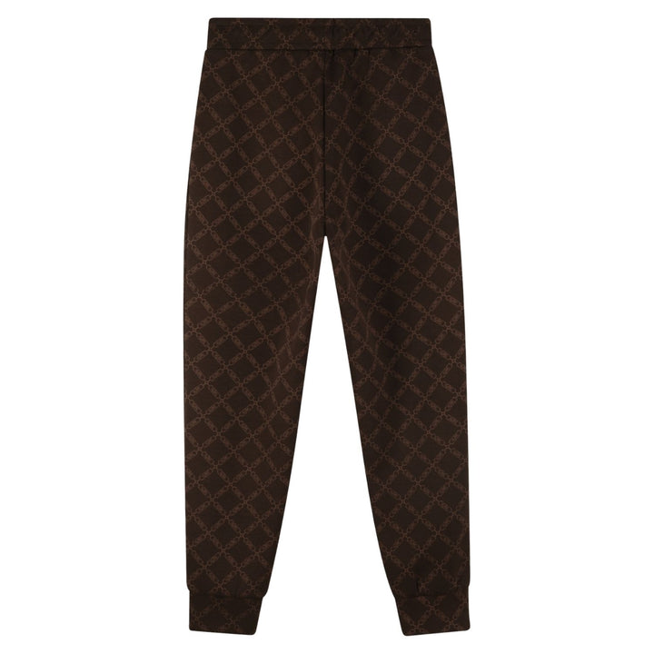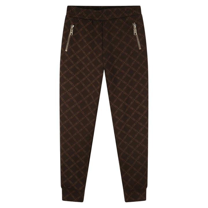 Girls brown pants featuring an all over logo print, crafted from a soft polyester viscose blend with added stretch for comfort.