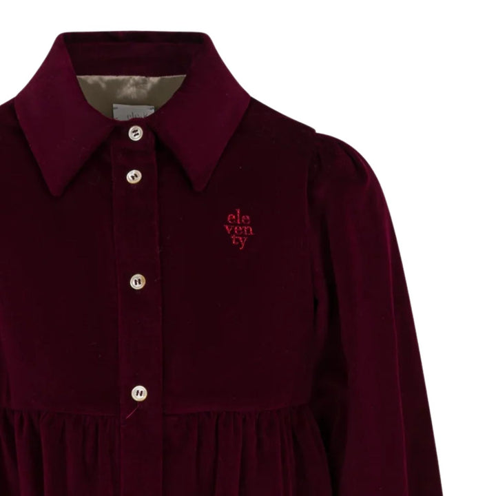 This girls burgundy button-fastening dress features a classic silhouette with a modern twist, crafted from soft, luxurious fabric for all-day comfort. The dress is accented by a neat collar, a full button-down front, and practical flap pockets that a