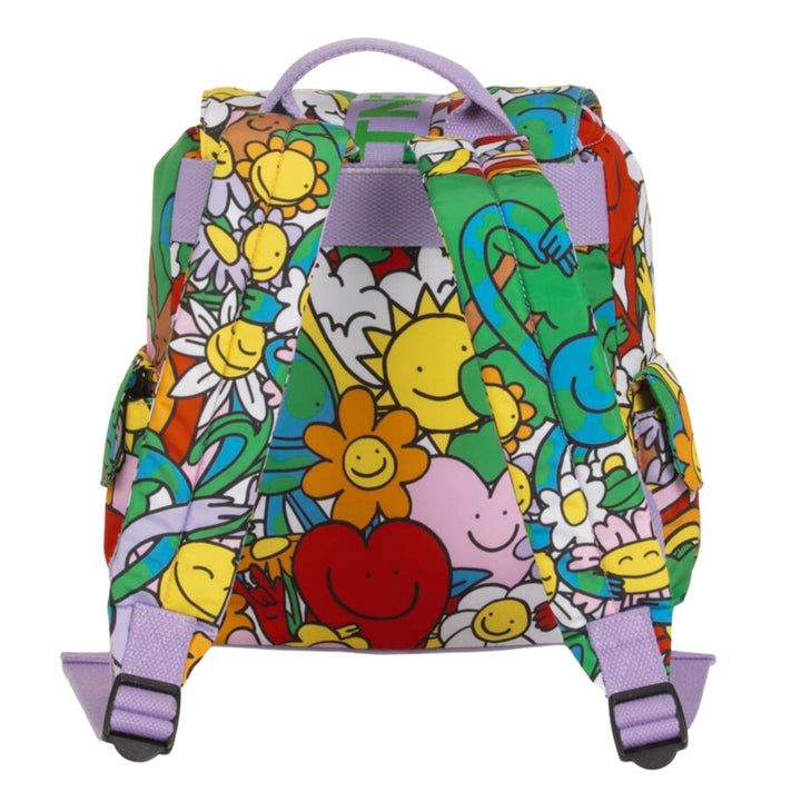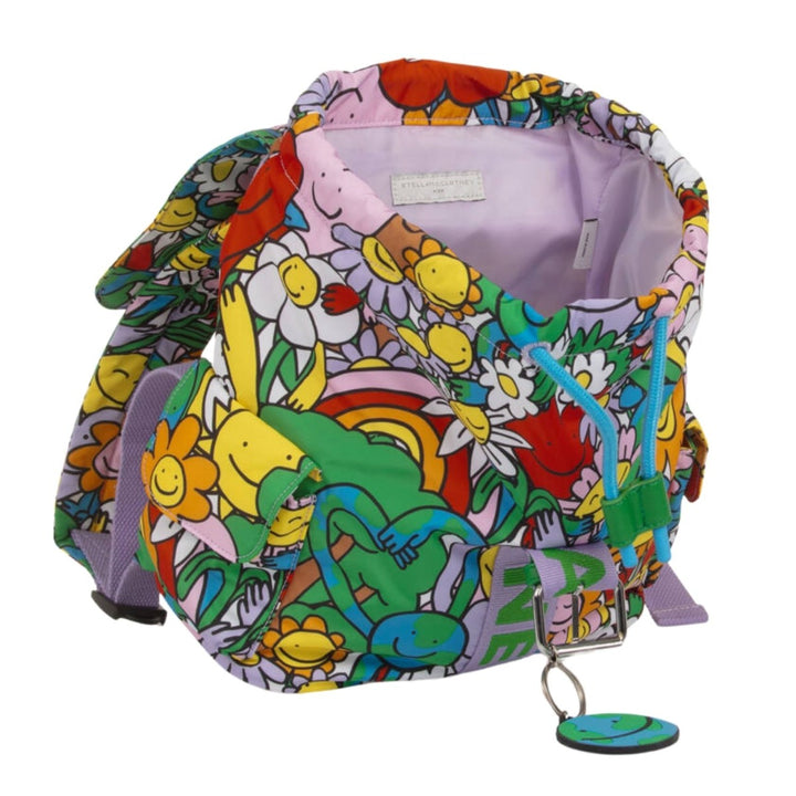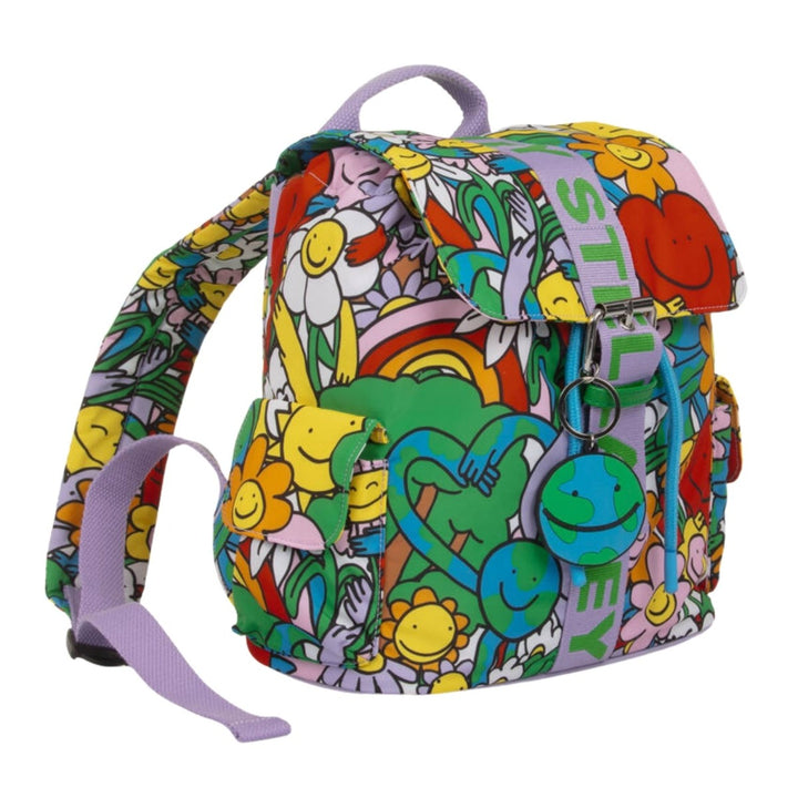 A vibrant and colourful backpack for girls by Stella McCartney Kids, with a cheerful pattern of planet Earth with smiling hearts, flowers and trees. Silky smooth, the bag has a drawstring compartment with a branded buckle-fastening flap over the top. There are popper fastening side pockets and adjustable padded straps for a comfortable fit. An attached bag charm adds a fun finish.