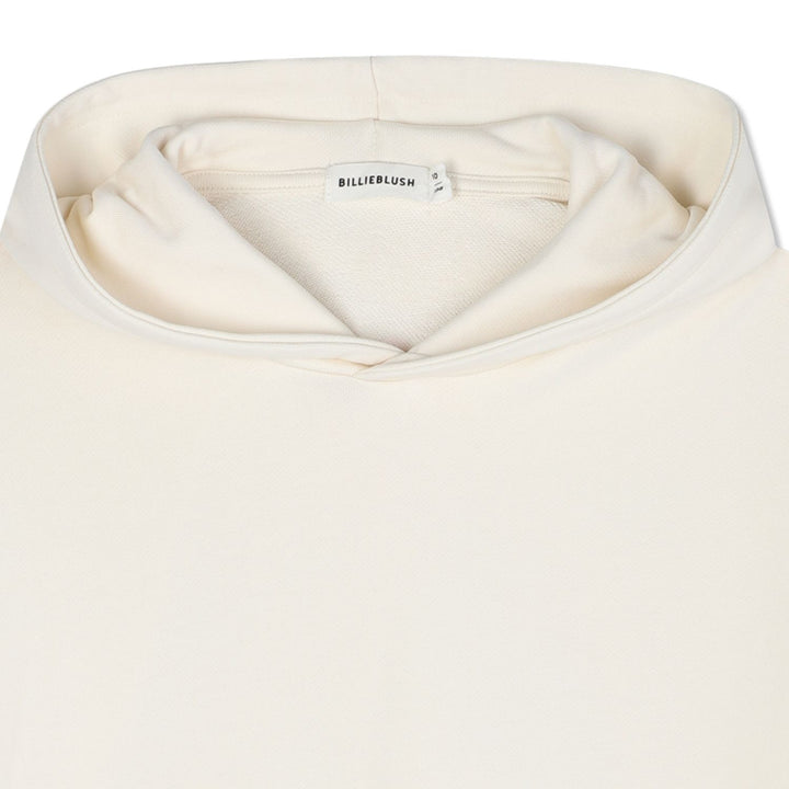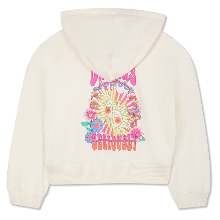 Girls cream hoodie made from 100% soft cotton, offering breathable comfort and a gentle feel on the skin. It features a clean front and a stylish graphic print on the back, complete with a hood, long sleeves, and a relaxed fit for everyday wear.