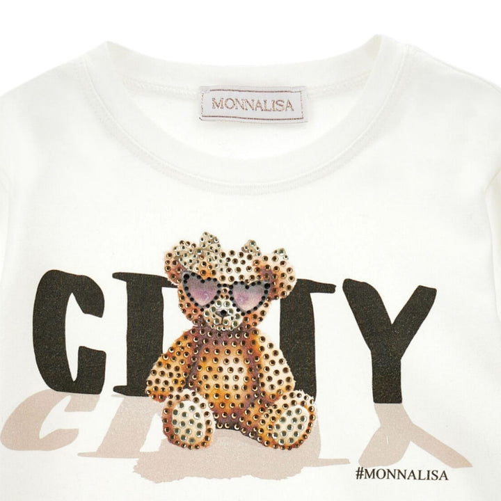 Adorable cream T-shirt featuring Monnalisa’s signature teddy bear logo print — a playful everyday essential with luxury charm.
