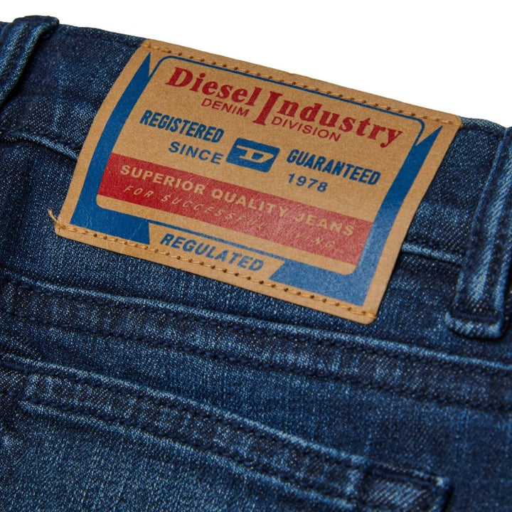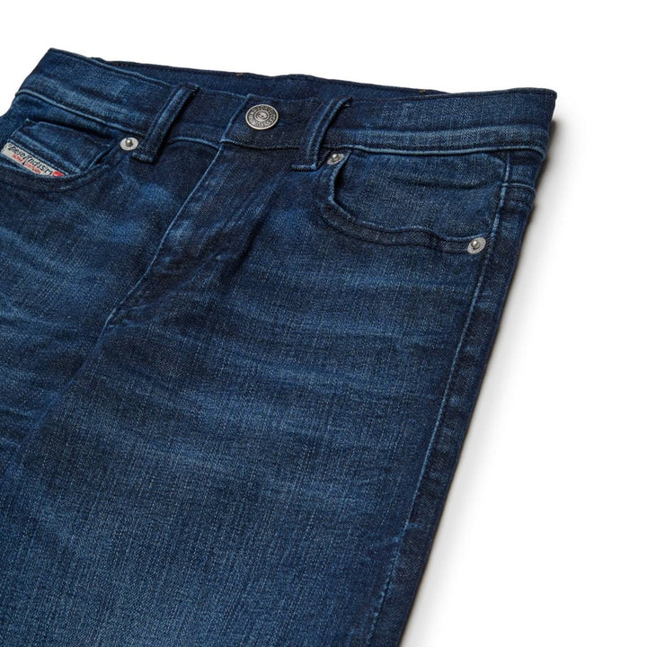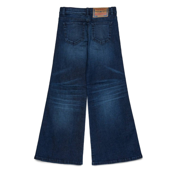 Blue wide-leg denim jeans for girls by Diesel, designed for comfort and style. Made with 98% cotton and 2% elastane, offering a soft feel with a hint of stretch. Ideal for everyday adventures.