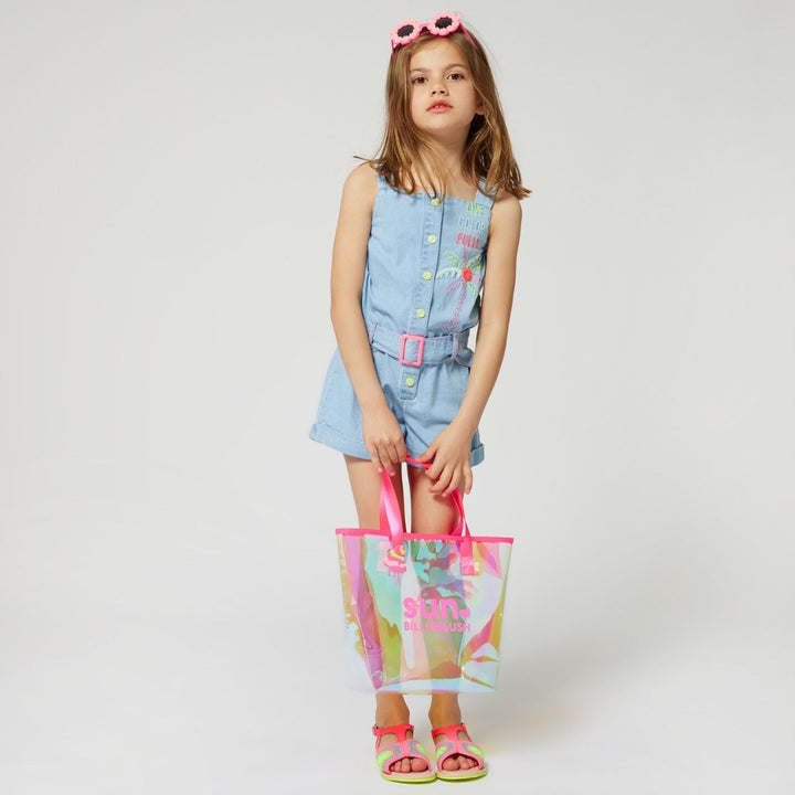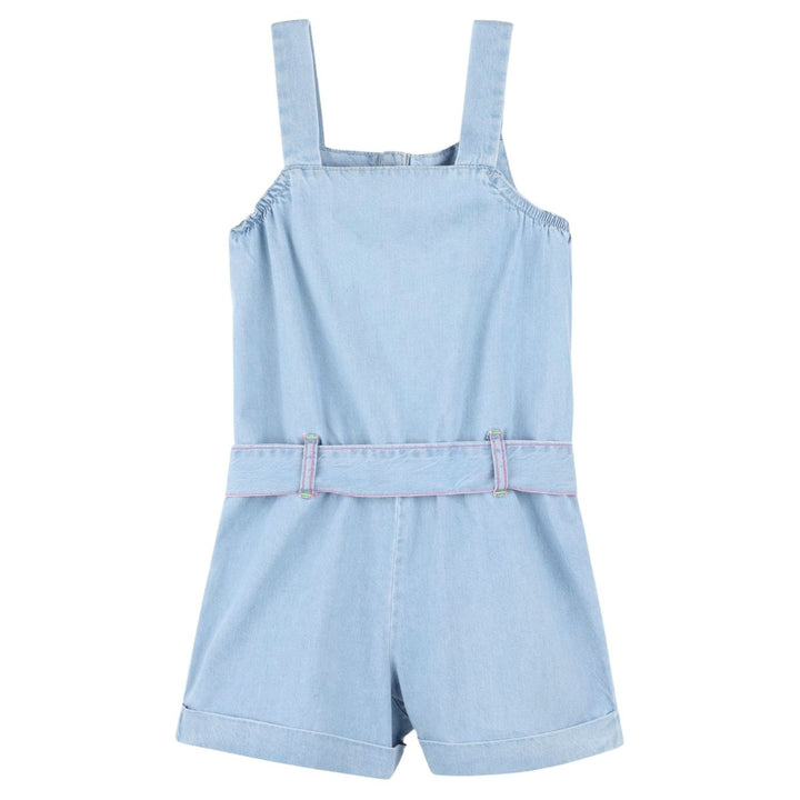 Light blue cotton playsuit for girls by Billieblush, made in soft denim. Cool and comfortable, it is embroidered on the front with a tropical palm tree design in the brand's signature neon yellow and pink shades. It fastens with sparkly, yellow poppers and comes with a matching belt to shape the waist.