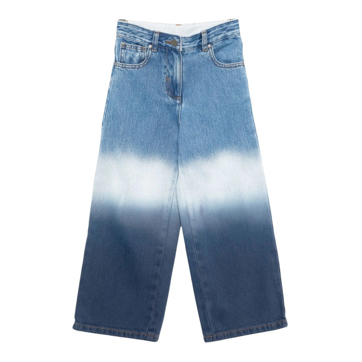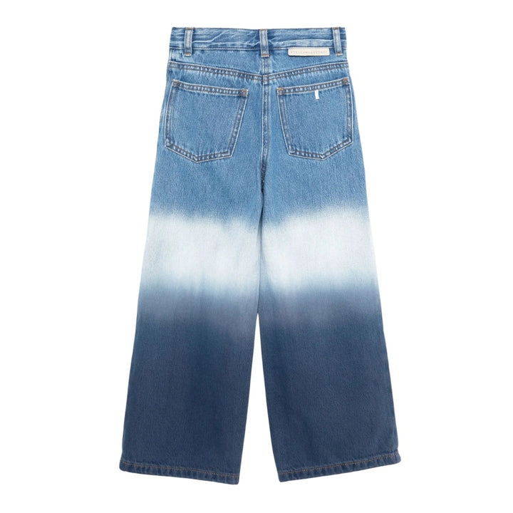 These stylish wide-leg jeans from Stella McCartney Kids feature a unique ombre effect, blending classic blue denim with a faded white gradient for a trendy, modern look. Crafted from sustainable cotton denim, these jeans offer a relaxed fit and a comfortable feel, making them perfect for everyday wear. With a classic five-pocket design, belt loops, and a button-and-zip closure, they combine fashion-forward aesthetics with practicality. A must-have statement piece for kids who love bold yet wearable styles.