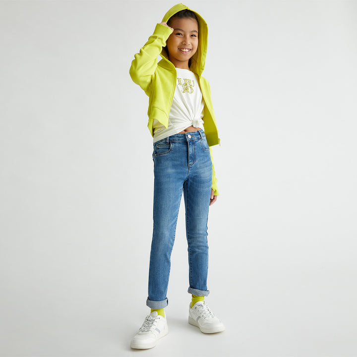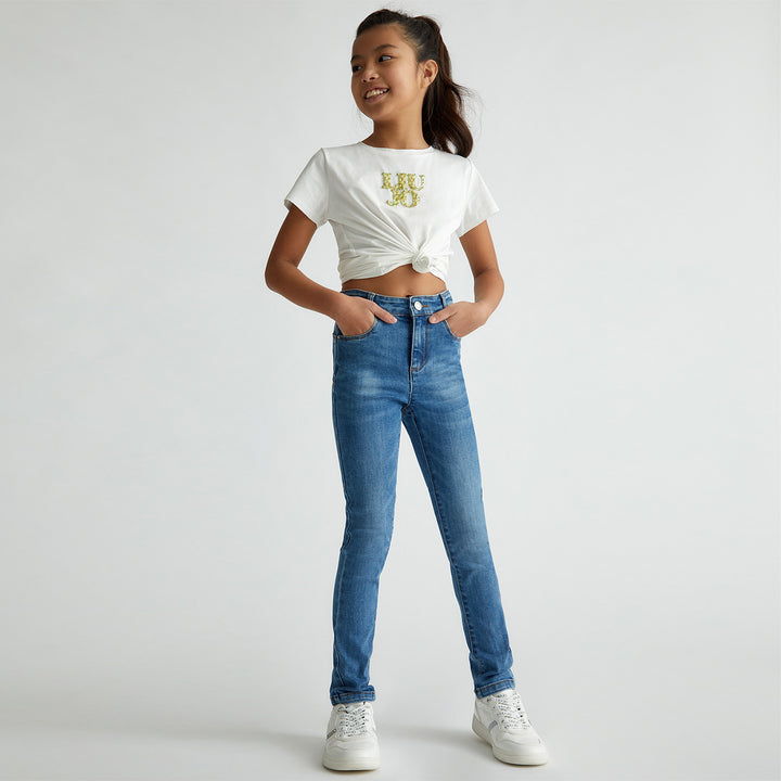 Classic blue skinny jeans for girls with a high-rise waist and slight faded detailing perfect for everyday wear with both casual and dressy tops.