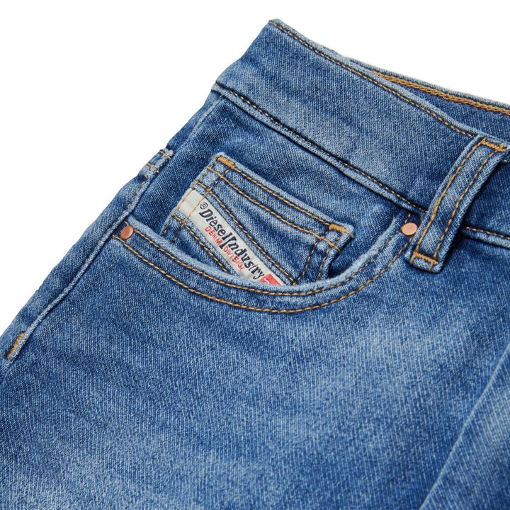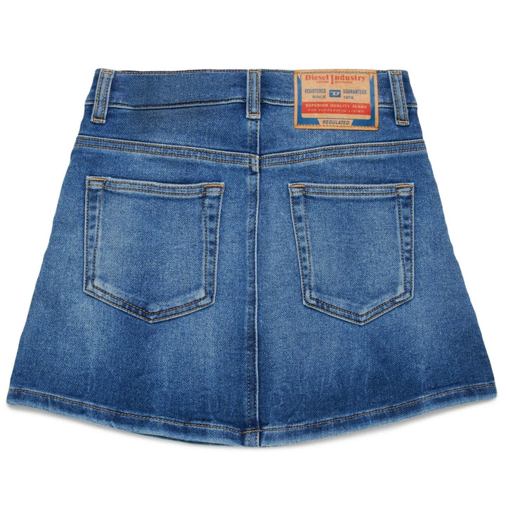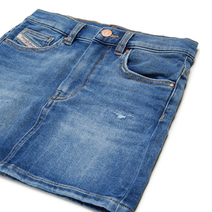 JoggJeans mini skirt. Made of soft-handle mid-blue denim, characterised by gradients, whiskers and contrasting coloured seams. Mending breaks with zig-zag on the front.