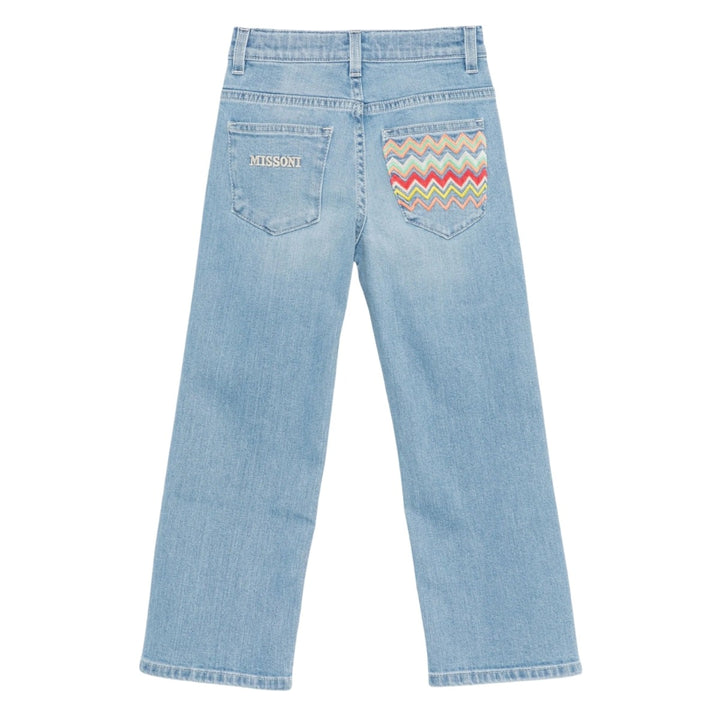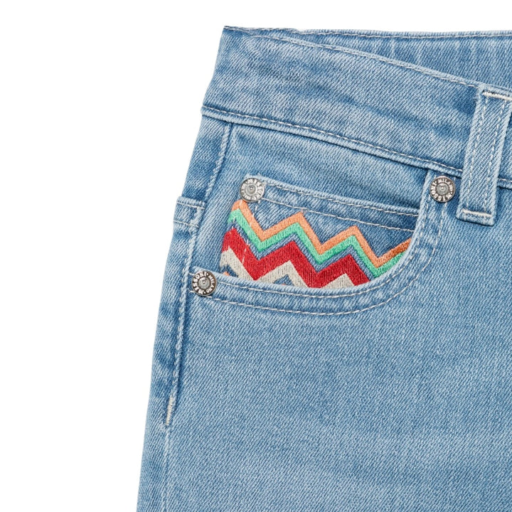 These Missoni Girls' Wide-Leg Jeans bring effortless style and comfort to your little one's wardrobe. Made from high-quality cotton denim, these light-wash jeans feature a relaxed, wide-leg silhouette for a modern and comfortable fit. The standout detail is the iconic Missoni zigzag embroidery on the front pocket, adding a signature touch of color and craftsmanship. Perfect for casual outings, these jeans pair easily with t-shirts, blouses, or sweaters for a stylish everyday look.