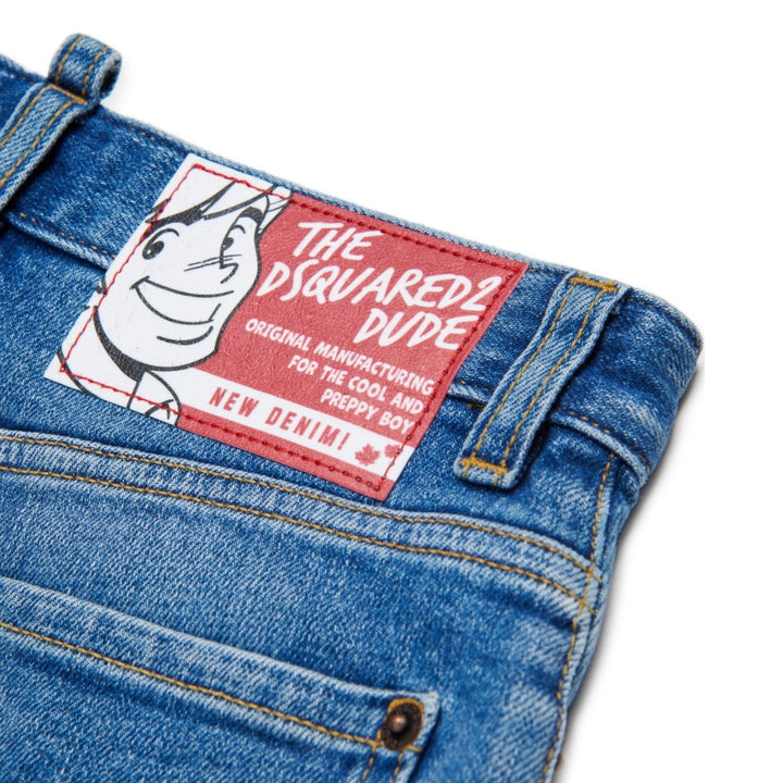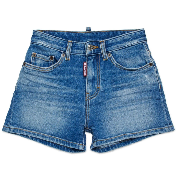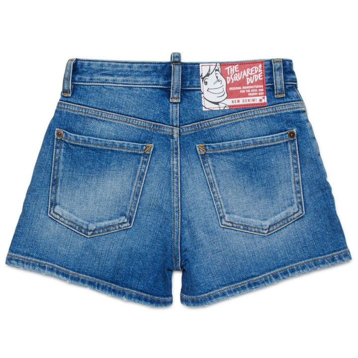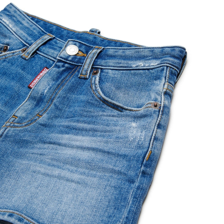 Jeans short pants. Made of medium blue denim, distinguished by contrasting colour gradients, whiskers and small abrasions. Dsquared2 label applied to the flap (flag logo).