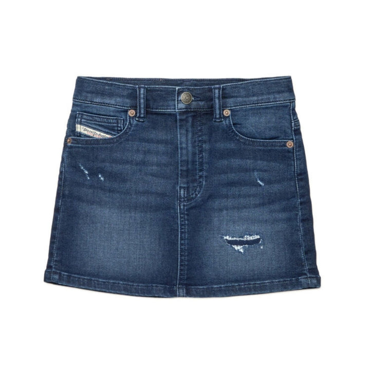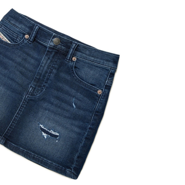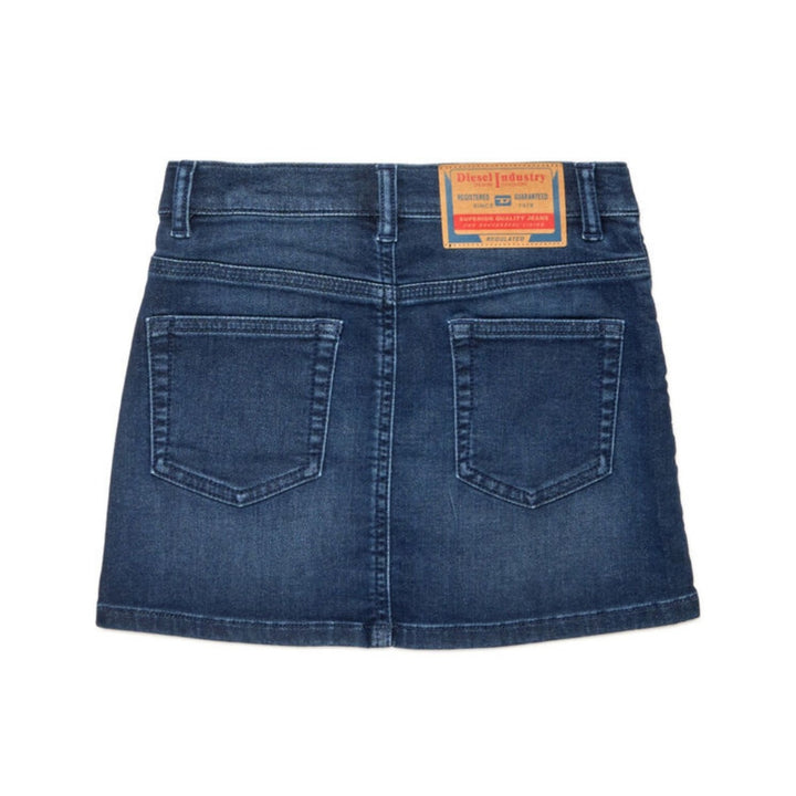 This girls mini skirt is cut from stretchy cotton-blend denim in a dark blue wash. It flaunts a classic 5-pocket construction with a Diesel Industry patch on the back waist.