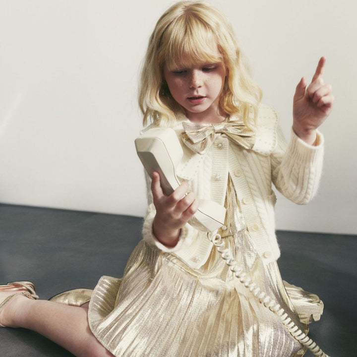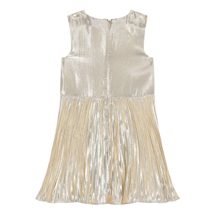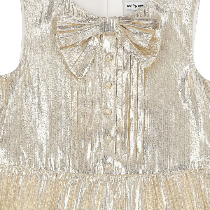 Beautiful gold dress for girls by Self-Portrait, made from soft, silky fabric with a subtle sheen. This elegant design features a fixed bow on the chest and soft pleats that create a graceful silhouette. Lined in lightweight voile for added comfort,