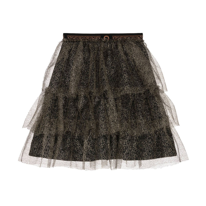 Glamorous golden skirt for girls by AIGNER, in tiered gathered layers of patterned tulle that catch the light beautifully. Combining comfort and style, it is lined in lightweight cotton twill and has an elasticated black waistband with a copper filig