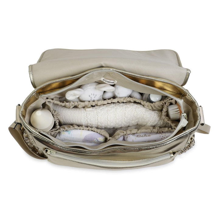 Add a touch of glamour to everyday outings with this elegant gold metallic changing bag. Crafted from 1% polyacrylate, it features a shimmering logo print and spacious interior to carry all essentials with ease. Designed for both style and practicali