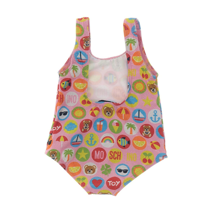 Girls graphic-print U-neck swimsuit from MOSCHINO KIDS featuring white/multicolour, all-over graphic print, metallic threading, U-neck and sleeveless. Be mindful to try on swimwear over your own garments..