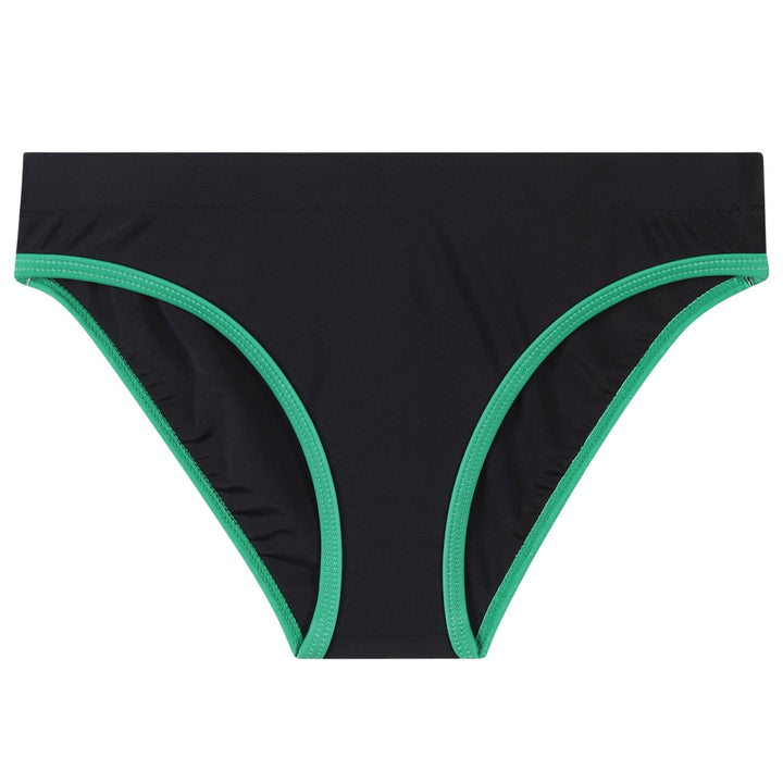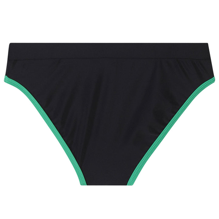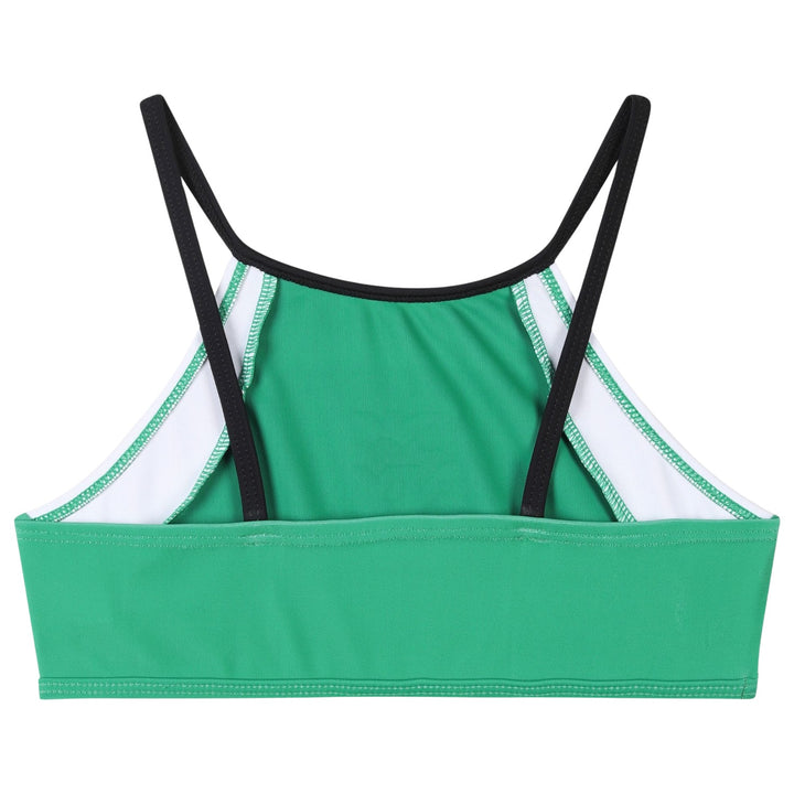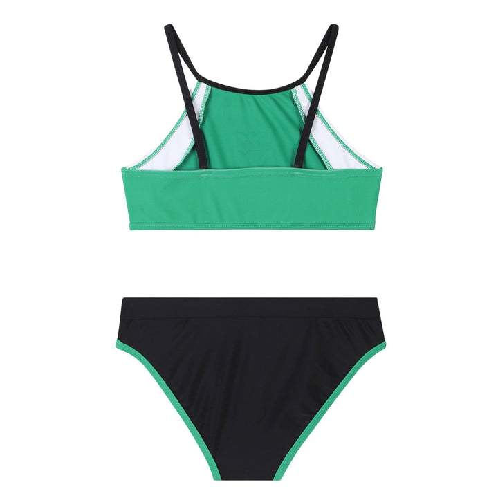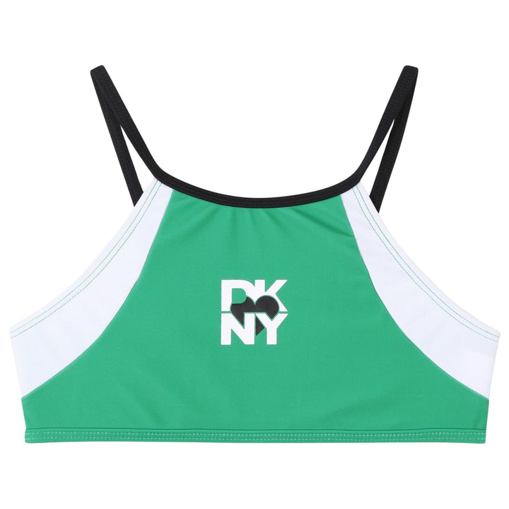 This DKNY two-piece bikini set features a sporty and stylish design, perfect for active beach days or poolside fun. The top has a high-neck cut with a racerback-style fit, offering both support and comfort. It comes in a striking green, white, and black color combination, with the DKNY logo printed on the front. The matching black bikini bottoms have green piping accents, complementing the top for a cohesive look. Made from quick-drying, stretchable fabric, this swimsuit is ideal for both swimming and lounging in style.