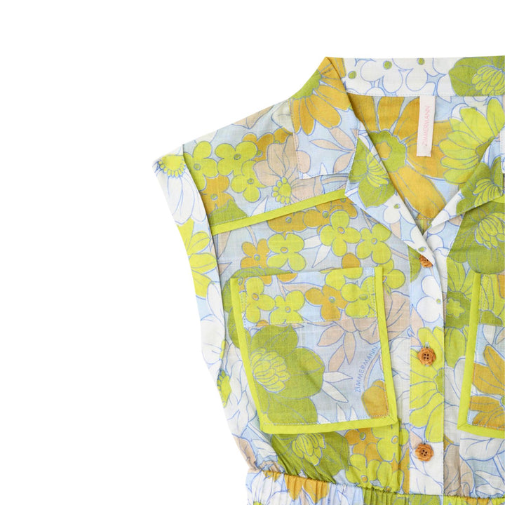 The Pop Utility Dress in Green Multi Floral from our Summer Swim 224 Collection. A cotton dress featuring a utility silhouette and buttons down the centre front.