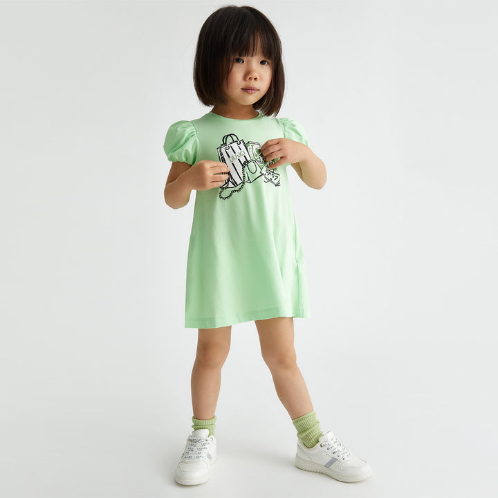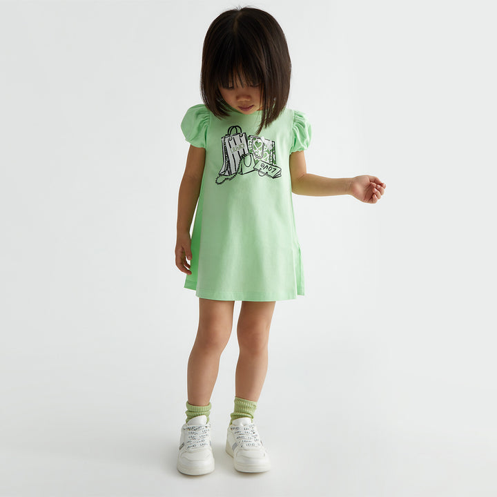Fresh, fun, and fashion forward this mint green dress is perfect for little style icons. Featuring short puff sleeves and a playful shopping-themed graphic print with shopping bags, accessories, and a LOVE clutch, it brings a trendy city vibe to her