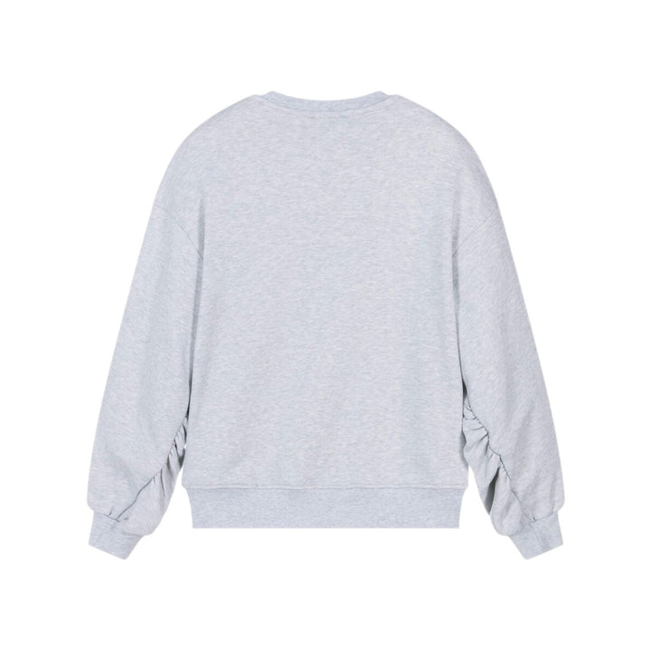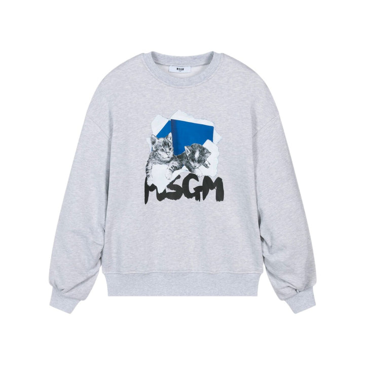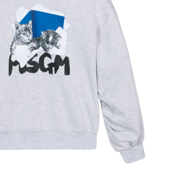 Grey marl sweatshirt for girls by MSGM, made in mid-weight cotton jersey with a fleecy inside. Easily layered over T-shirts, this long-sleeved top has ribbed trims and a relaxed fit. There is a kitten graphic on the front with a torn effect, positioned above the brand's MSGM brushstroke logo.